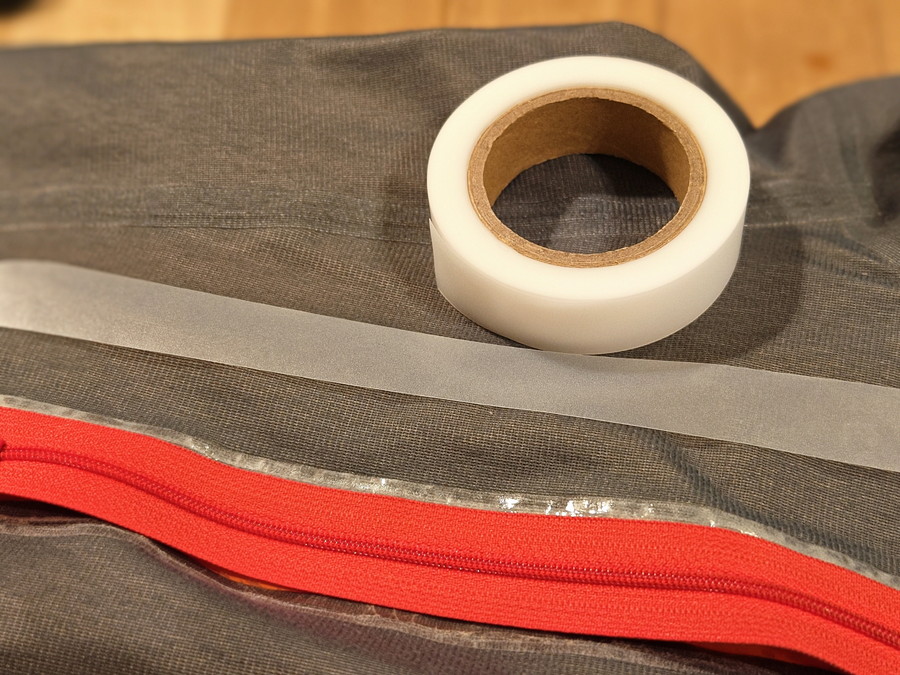 このままだとアイロンで圧着する際に、はみ出した両面テープがあて布に貼りついてしまうので、シームテープを上から被せていきます。シームテープはアウトドアウェアのリペア全般に使える商品なので、持っている方も多いんじゃないかと思いますし、持っていなければこの機会に購入すれば色々な場面で活躍してくれますよ。(アークテリクス製品だとドローコードまわりなどが定番ですかね)