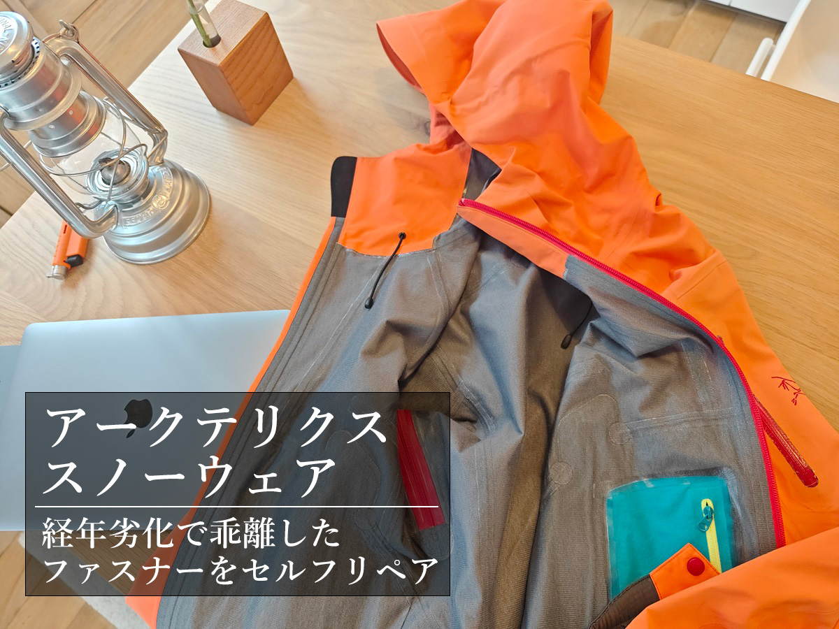 リペア作業時間ですが、シームテープ補修は何度かやったことがあって慣れていたものの、今回はファスナーに沿って両面テープをキレイに貼る作業に少々苦戦して、左右あわせて30分ちょっとかかりました。初リペアの人だと左右で1時間近くかかってしまうかもしれませんが、それで数万円する高価なウェアが復活するのであればお安い御用というものではないでしょうか。