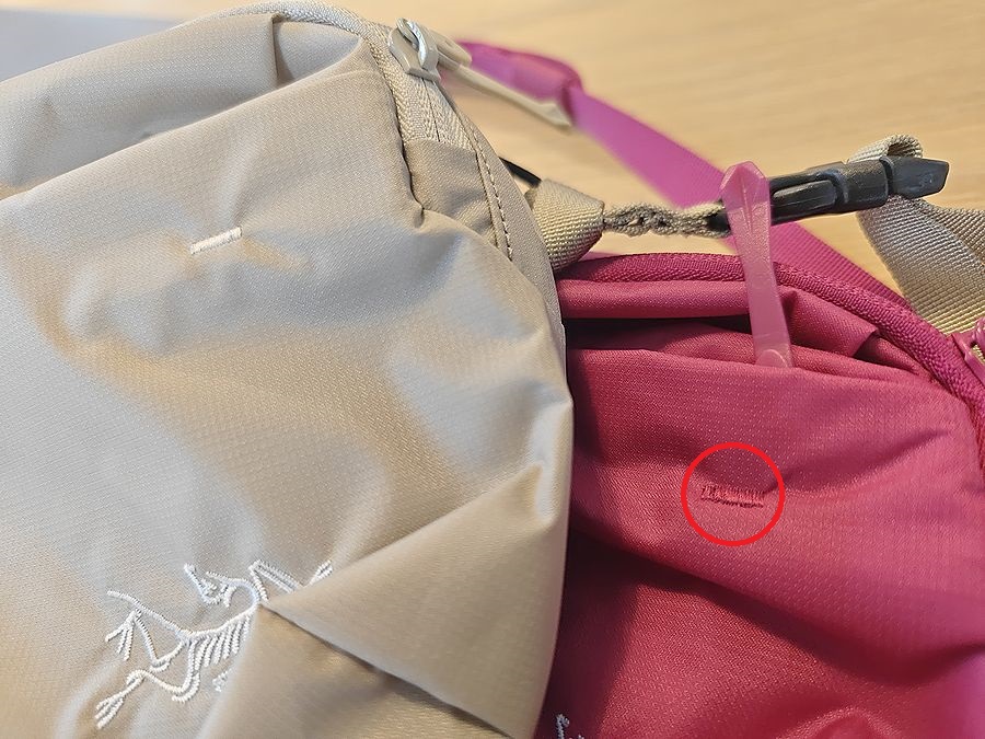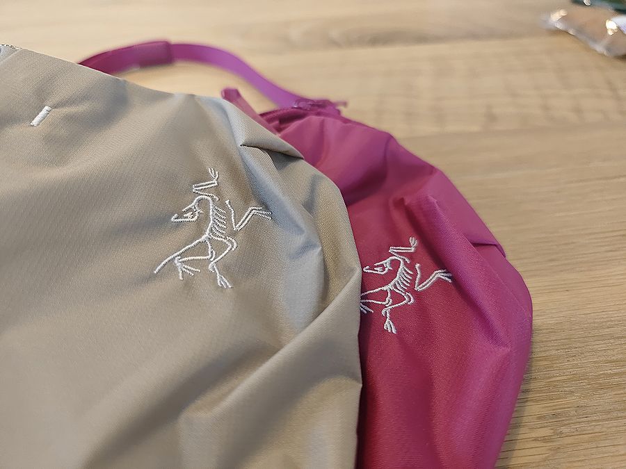 まず写真だと難しい素材の質感。ヒリアドはサラっとしたナイロン素材が使われていますが、質感がザラザラして安っぽいだとか生地が薄っぺらいだとか、見て触ってわかる範囲での違いは感じられません。アークテリクスブランドの象徴である始祖鳥マークのステッチも、細かいディテールまで含めて違いは見当たりませんね。