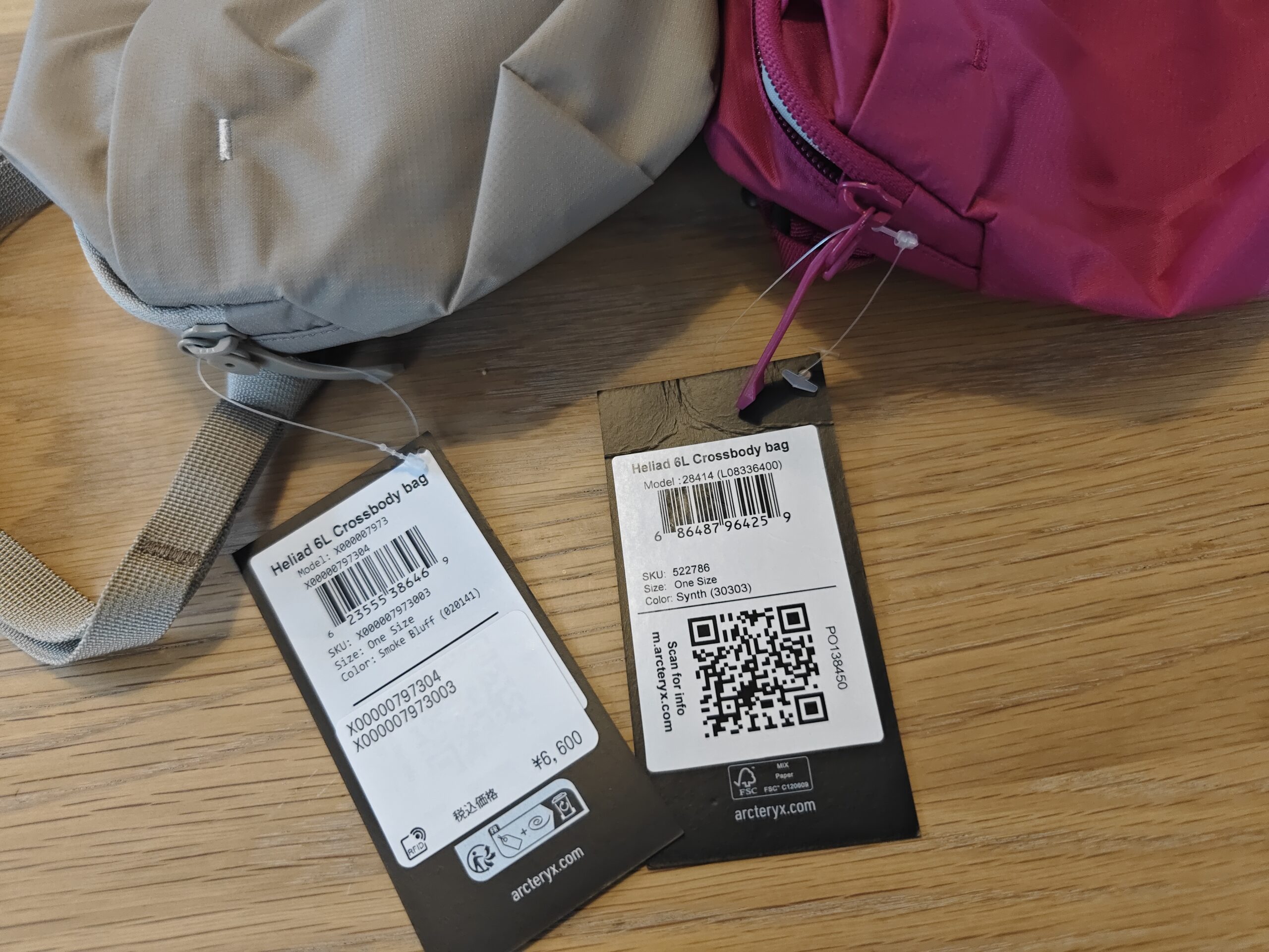 自分用のSmoke Bluffカラーはアークテリクス公式のオンラインショップで購入したので、間違いなく正規品です。一方でSynthカラーはすでにオンライン上に在庫が見当たらなかったため、偽物の可能性があることを嫁さんに説明のうえ、メルカリで出品されていたものを購入。
