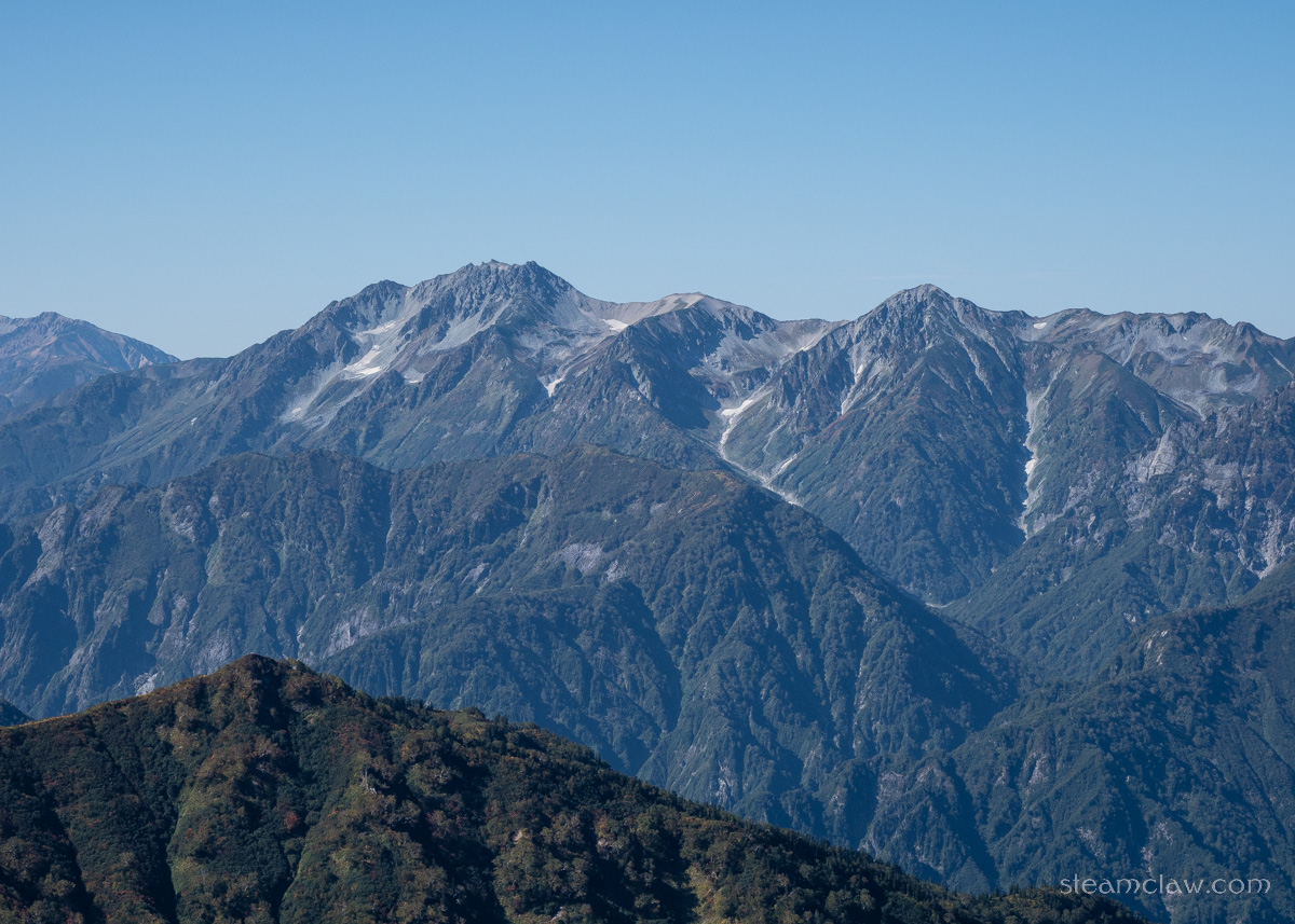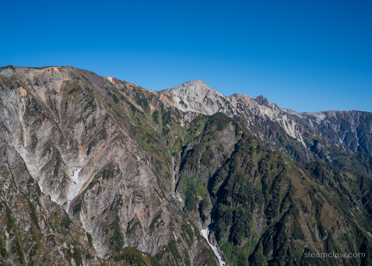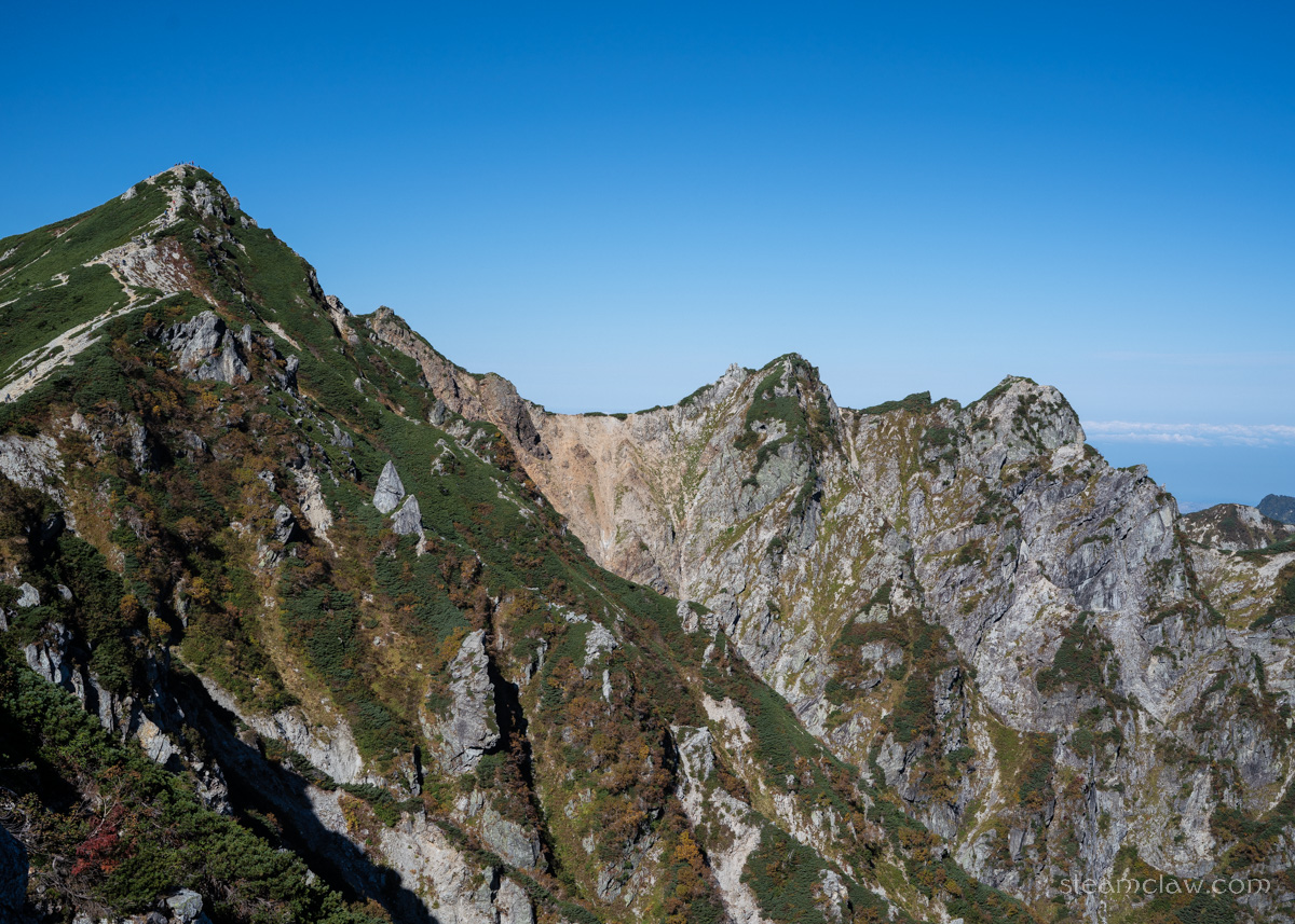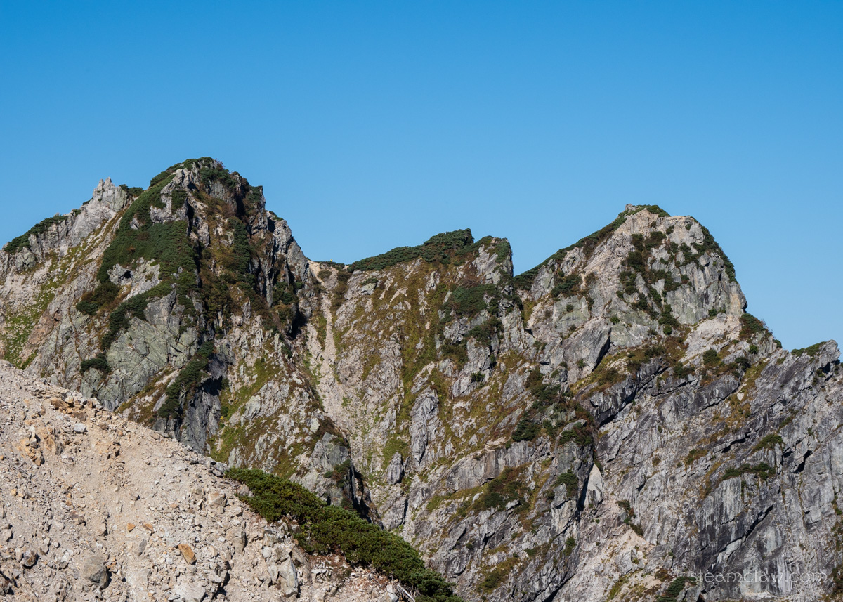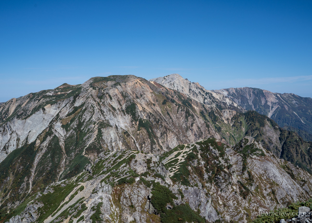 日本三大キレットの1つに数えられる不帰キレット、その核心部とされるのが鋸状にギザギザと並ぶ不帰嶮(北側、つまり右手から一峰、二峰、三峰)で、いかにも凶悪そうな山容。案の定というか破線ルートですが、ちょこちょこハイカーが見えたので、いずれチャレンジしてみたいですね。