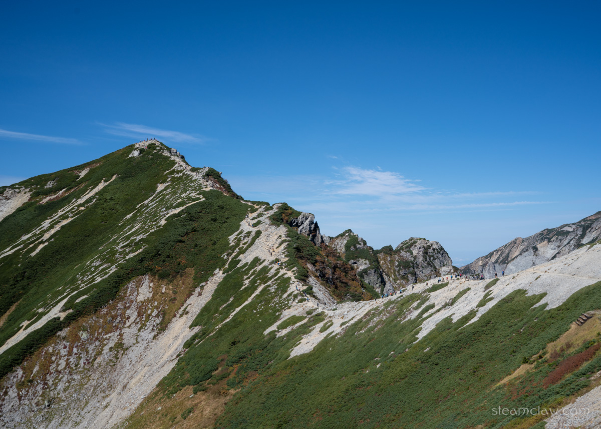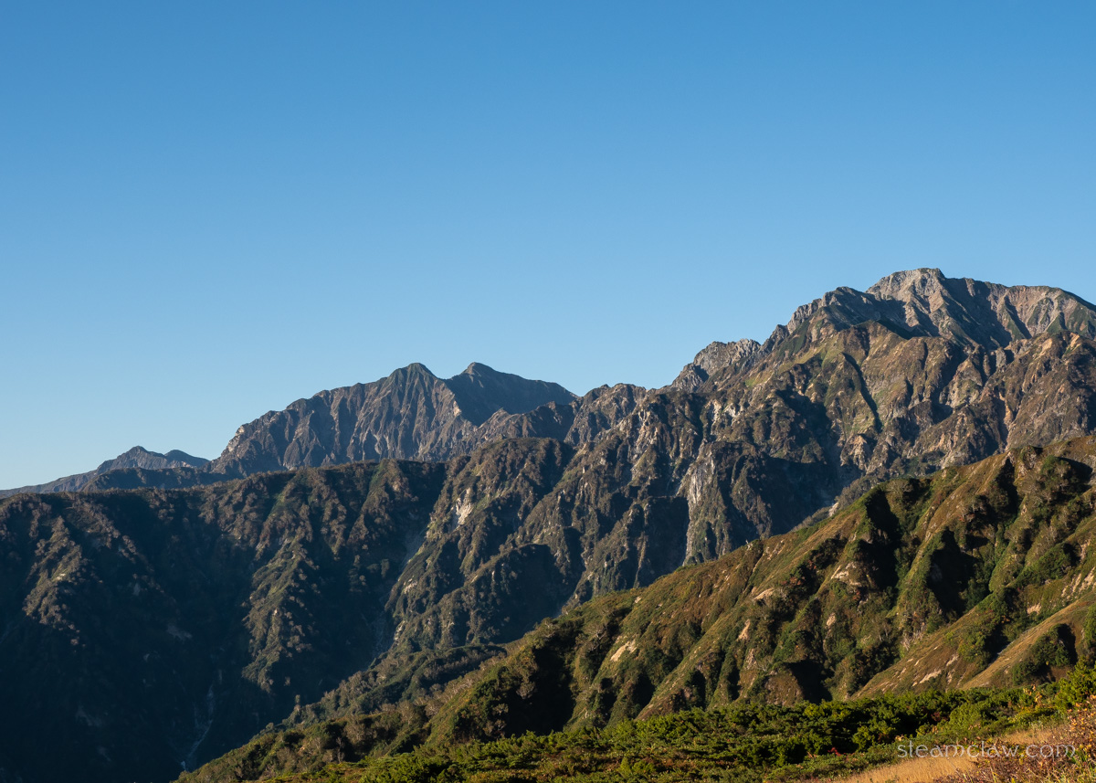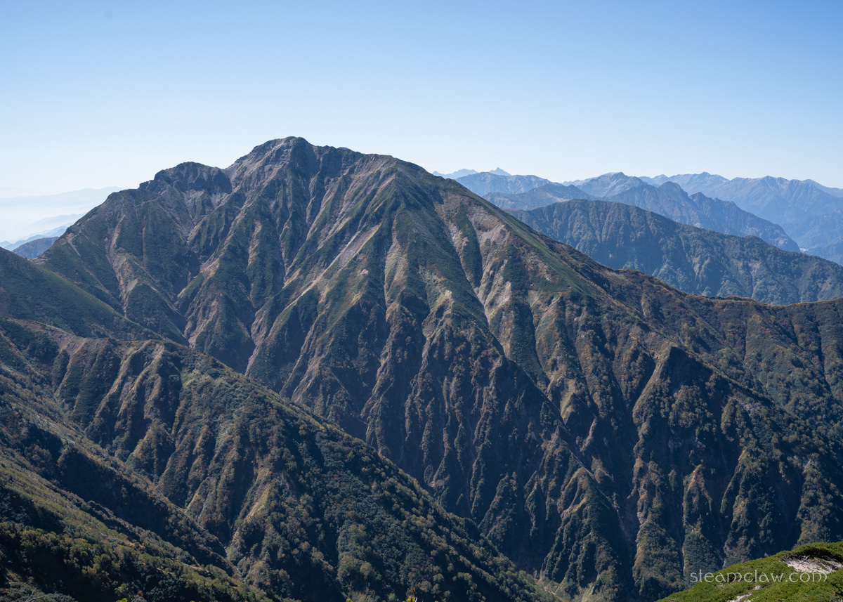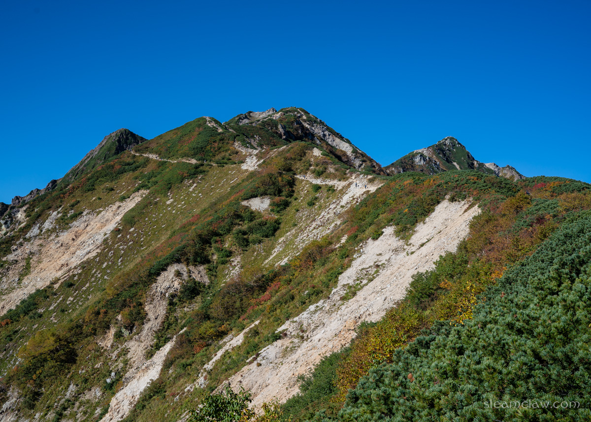 日本三大キレットの1つに数えられる不帰キレット、その核心部とされるのが鋸状にギザギザと並ぶ不帰嶮(北側、つまり右手から一峰、二峰、三峰)で、いかにも凶悪そうな山容。案の定というか破線ルートですが、ちょこちょこハイカーが見えたので、いずれチャレンジしてみたいですね。