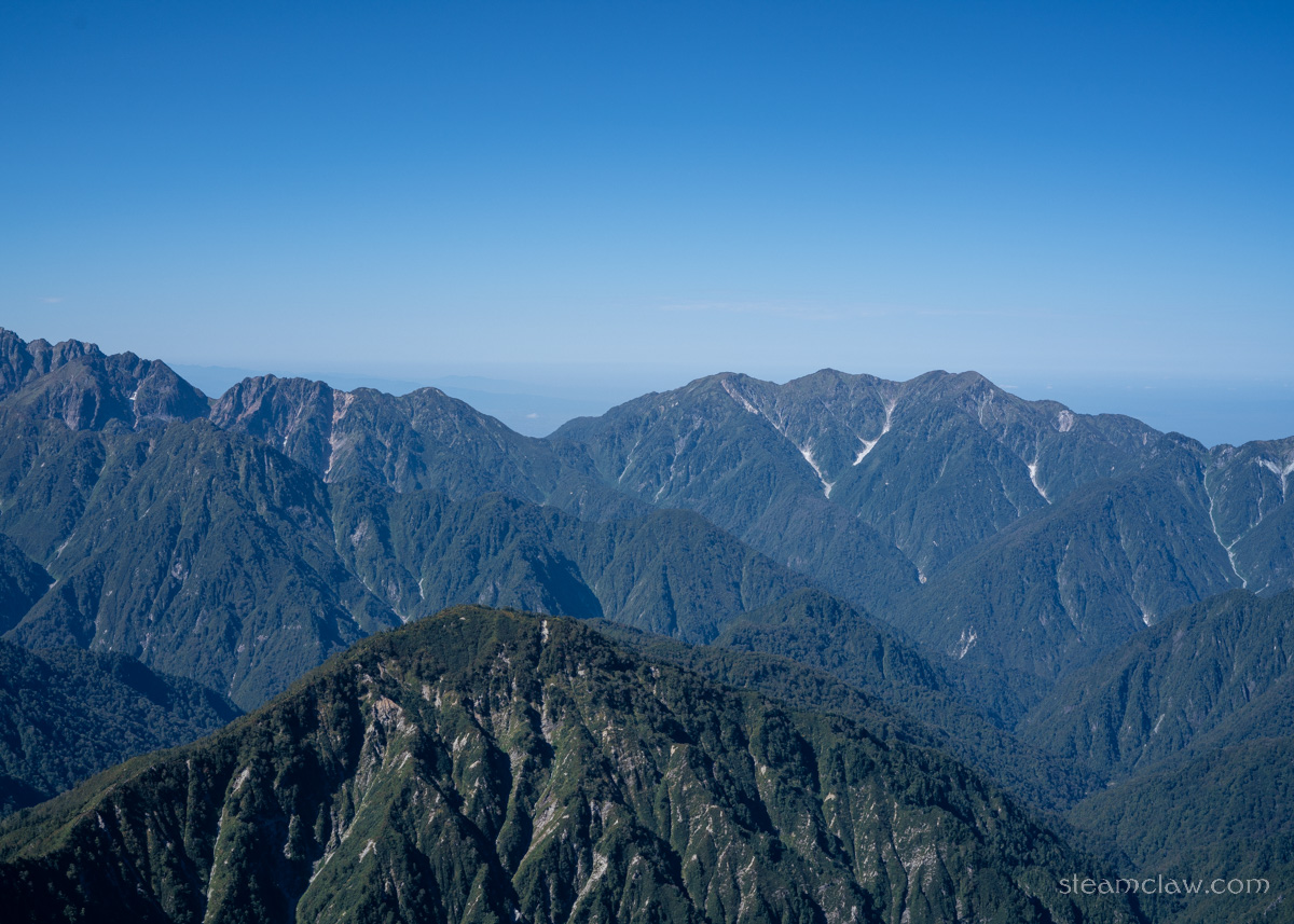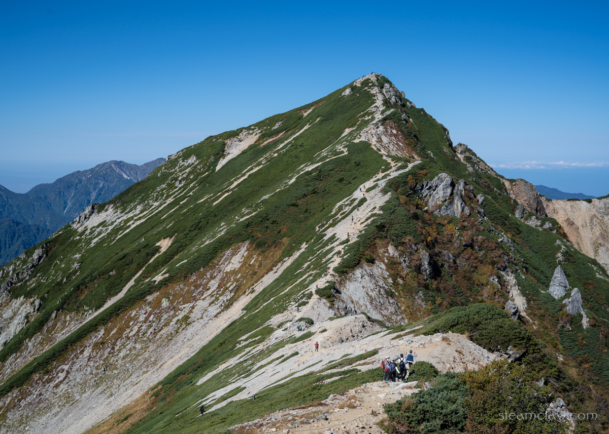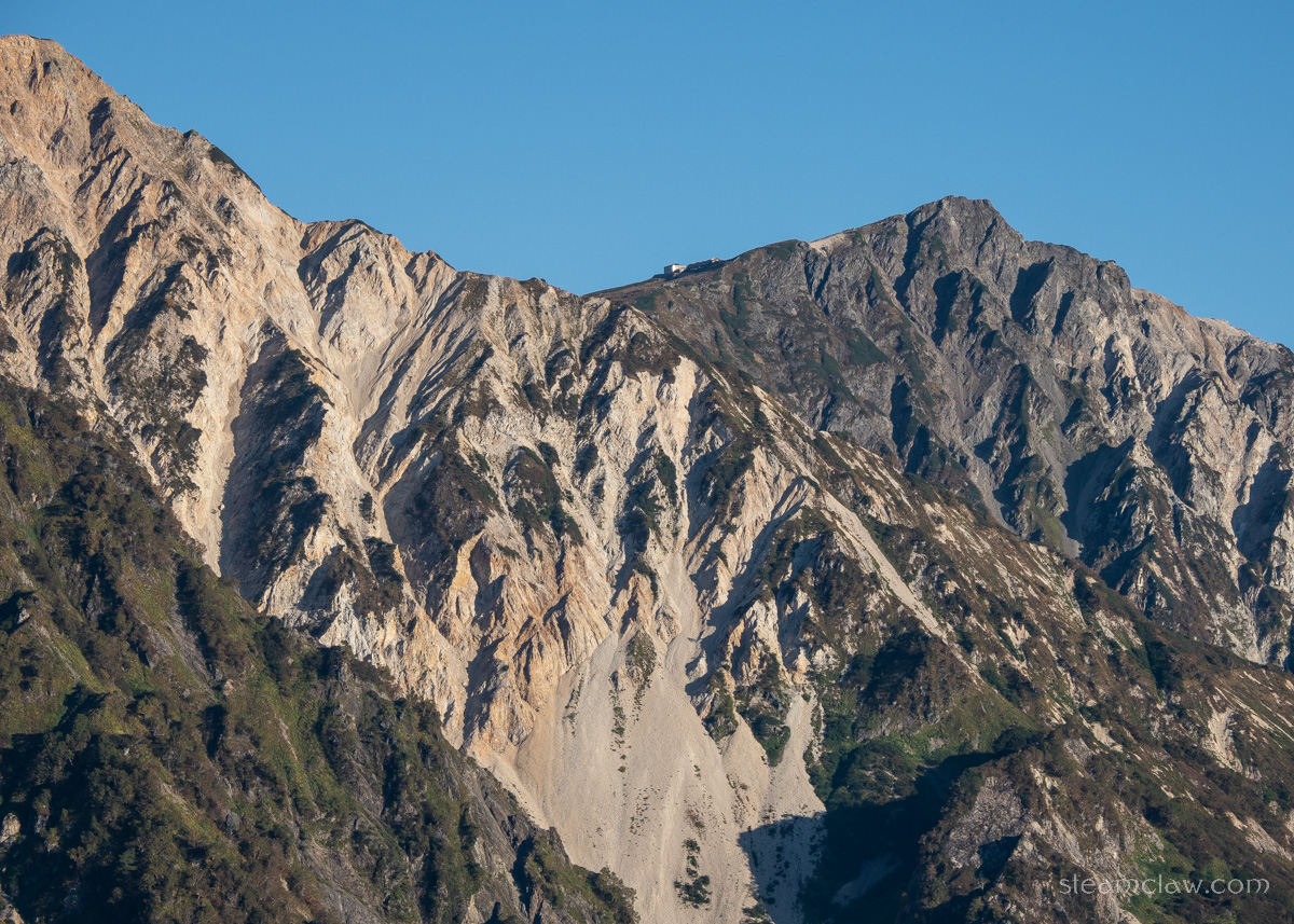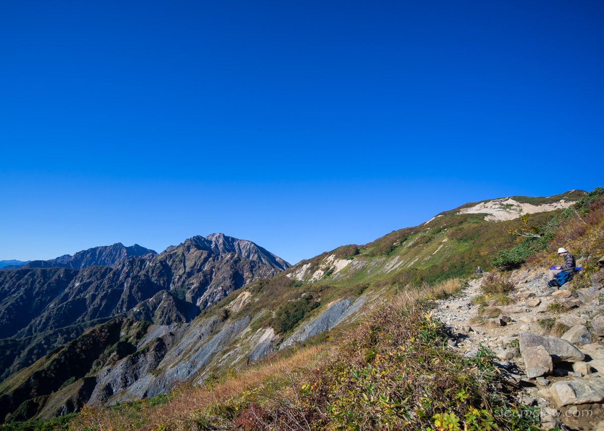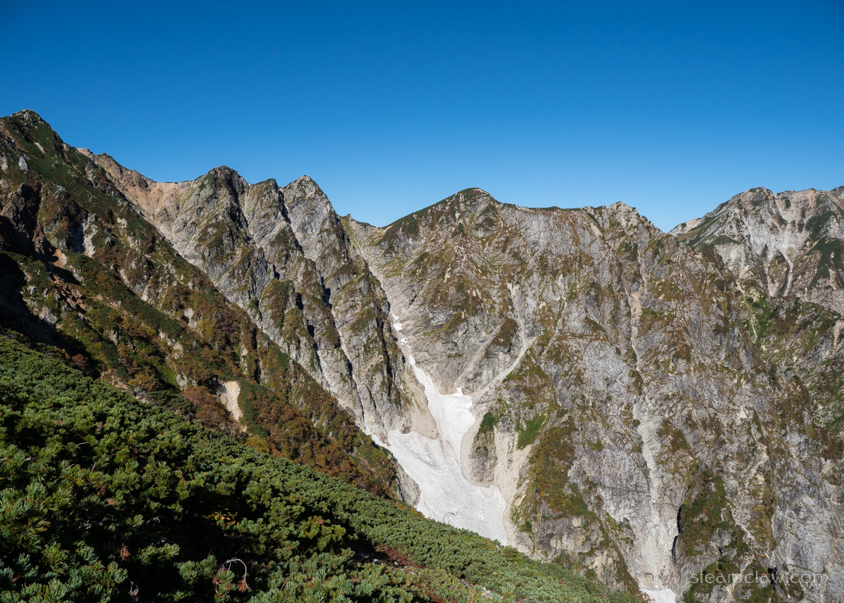 日本三大キレットの1つに数えられる不帰キレット、その核心部とされるのが鋸状にギザギザと並ぶ不帰嶮(北側、つまり右手から一峰、二峰、三峰)で、いかにも凶悪そうな山容。案の定というか破線ルートですが、ちょこちょこハイカーが見えたので、いずれチャレンジしてみたいですね。