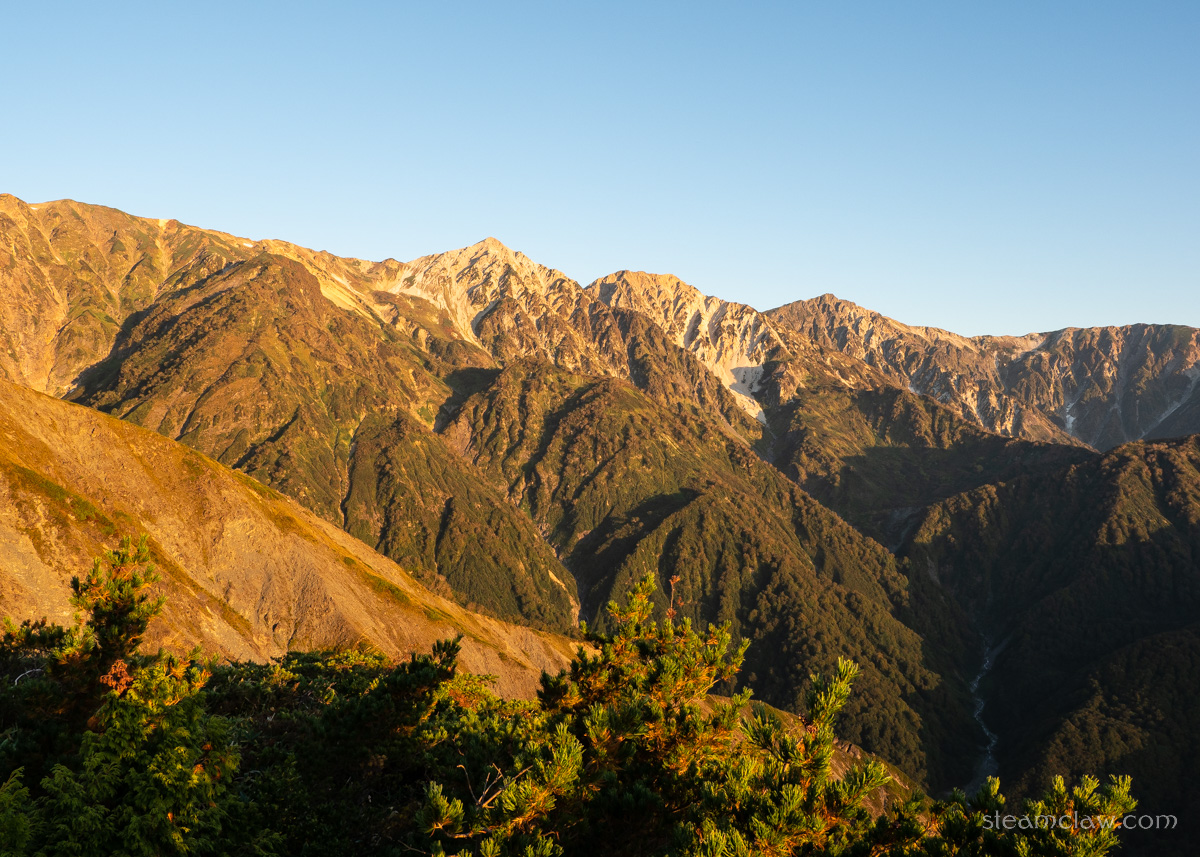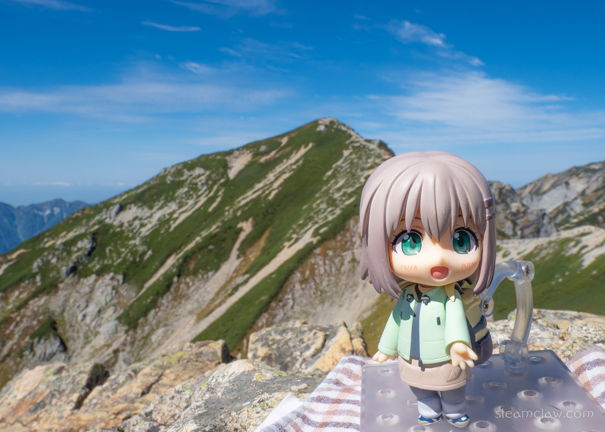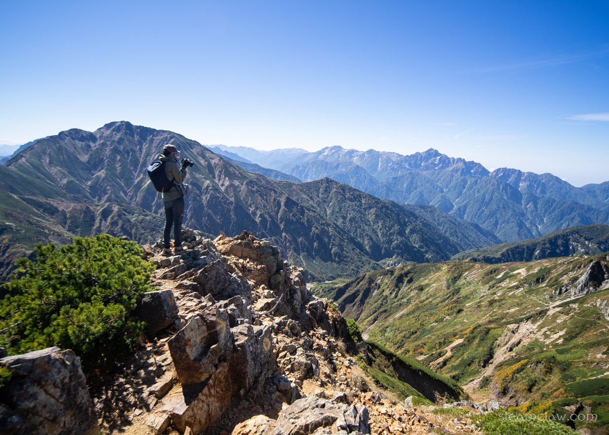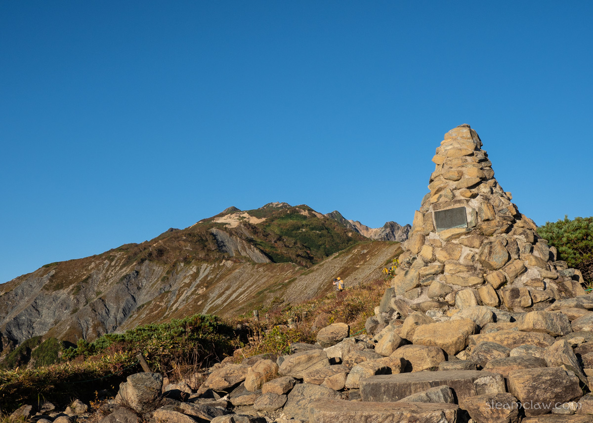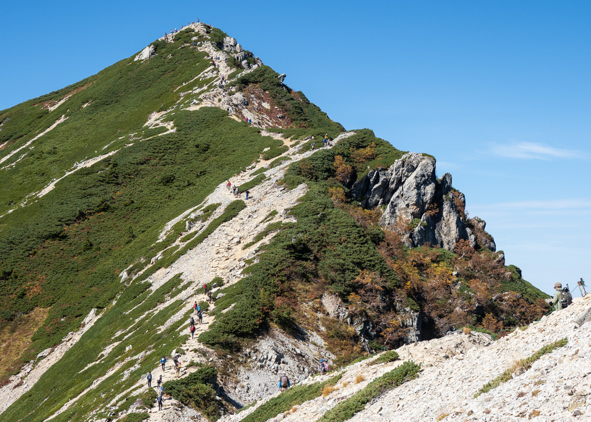日本三大キレットの1つに数えられる不帰キレット、その核心部とされるのが鋸状にギザギザと並ぶ不帰嶮(北側、つまり右手から一峰、二峰、三峰)で、いかにも凶悪そうな山容。案の定というか破線ルートですが、ちょこちょこハイカーが見えたので、いずれチャレンジしてみたいですね。