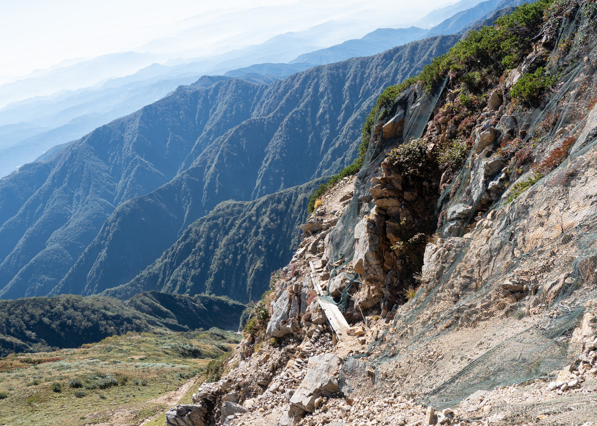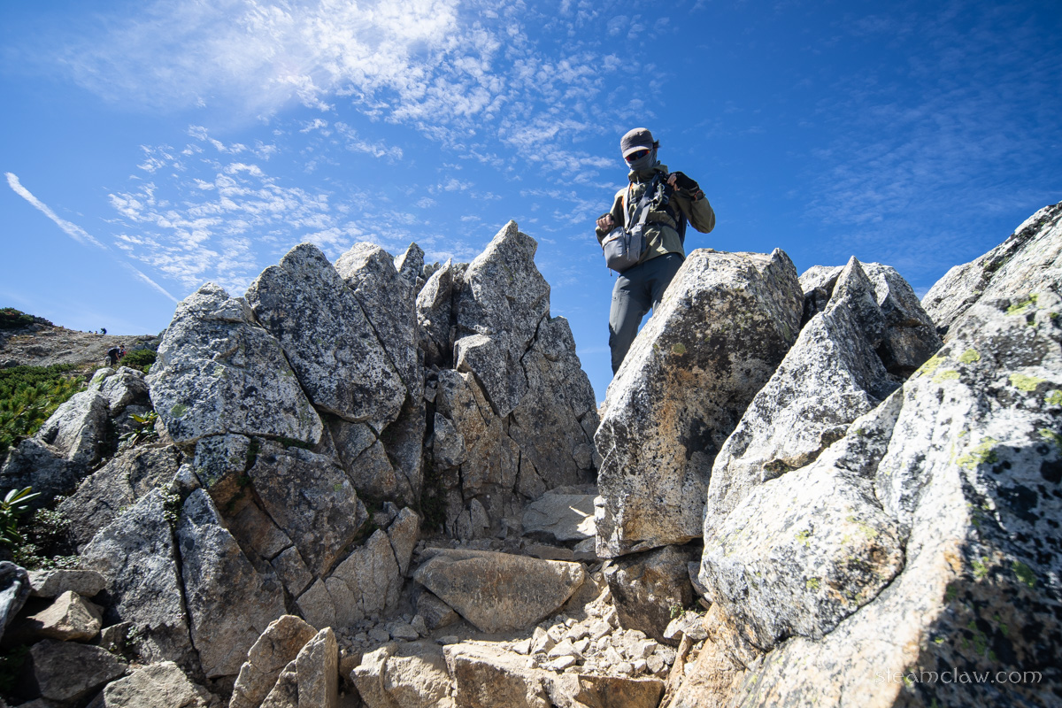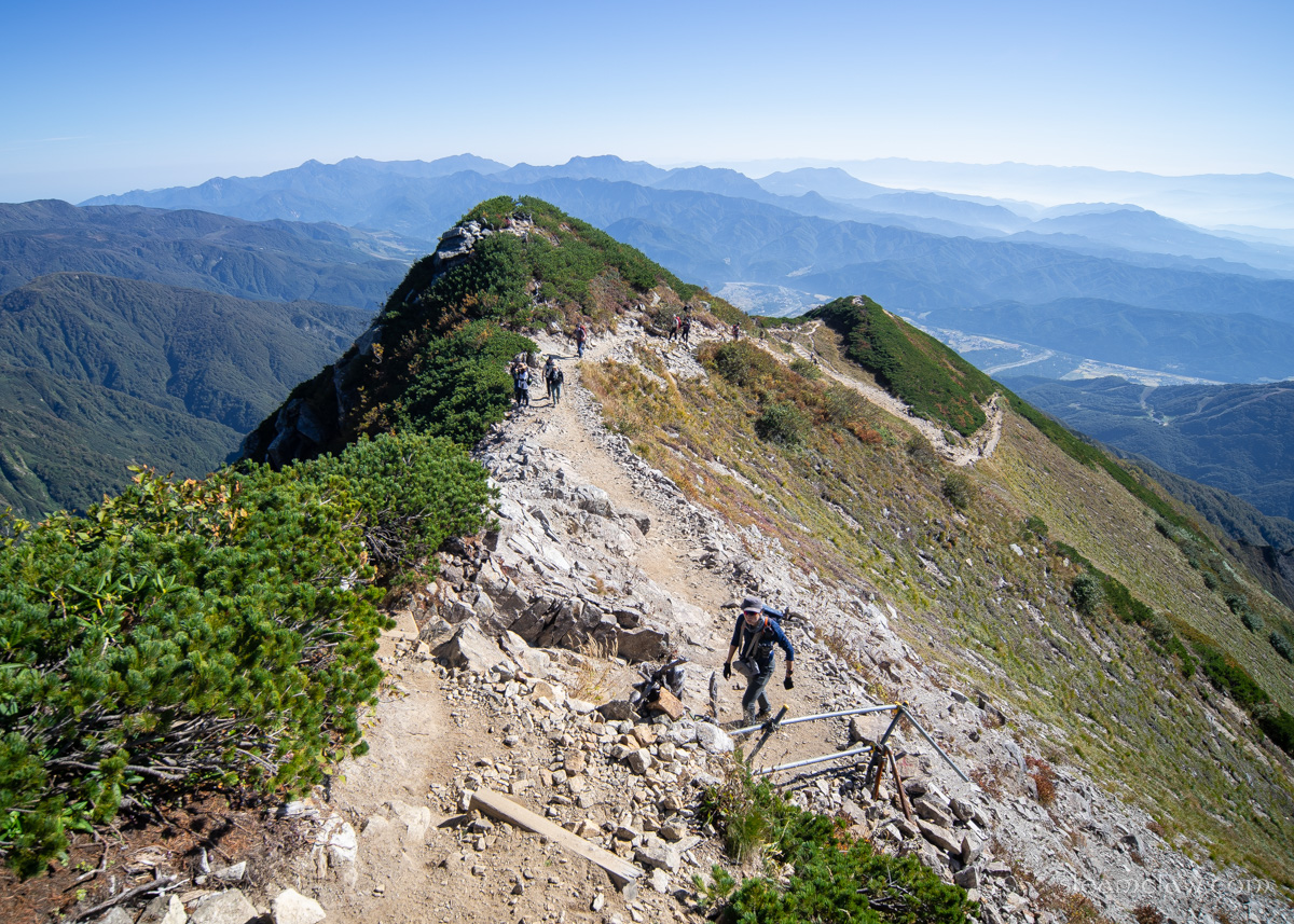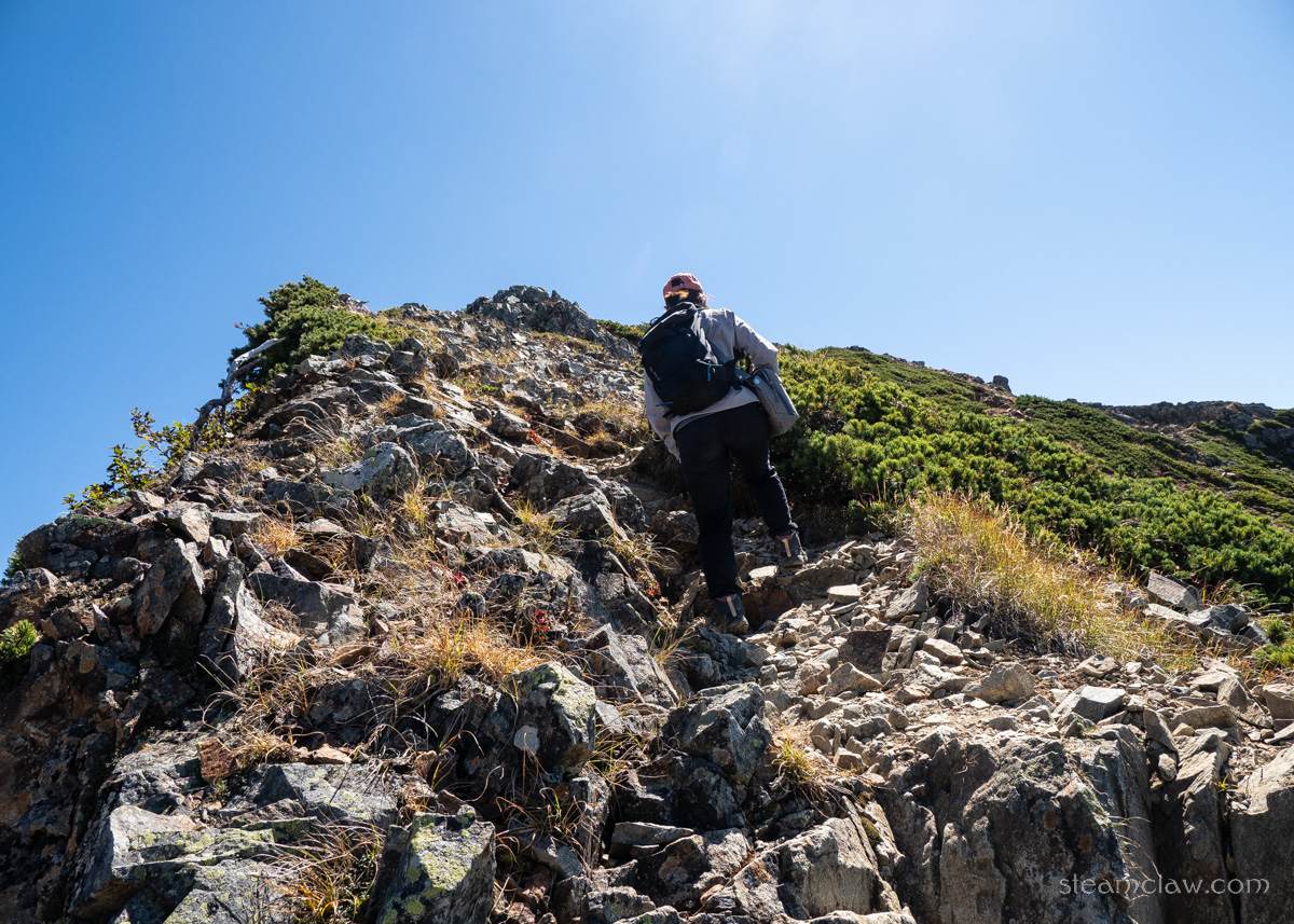 ここからは唐松岳頂上山荘に向かって最後の登り。登山道は高度感のある尾根に沿って伸びていくのですが、ところどころ崩落が進んでおり、ごく僅かながらもガレ場があるという八方尾根コースで唯一険しい区間となります。