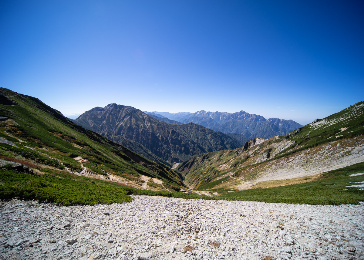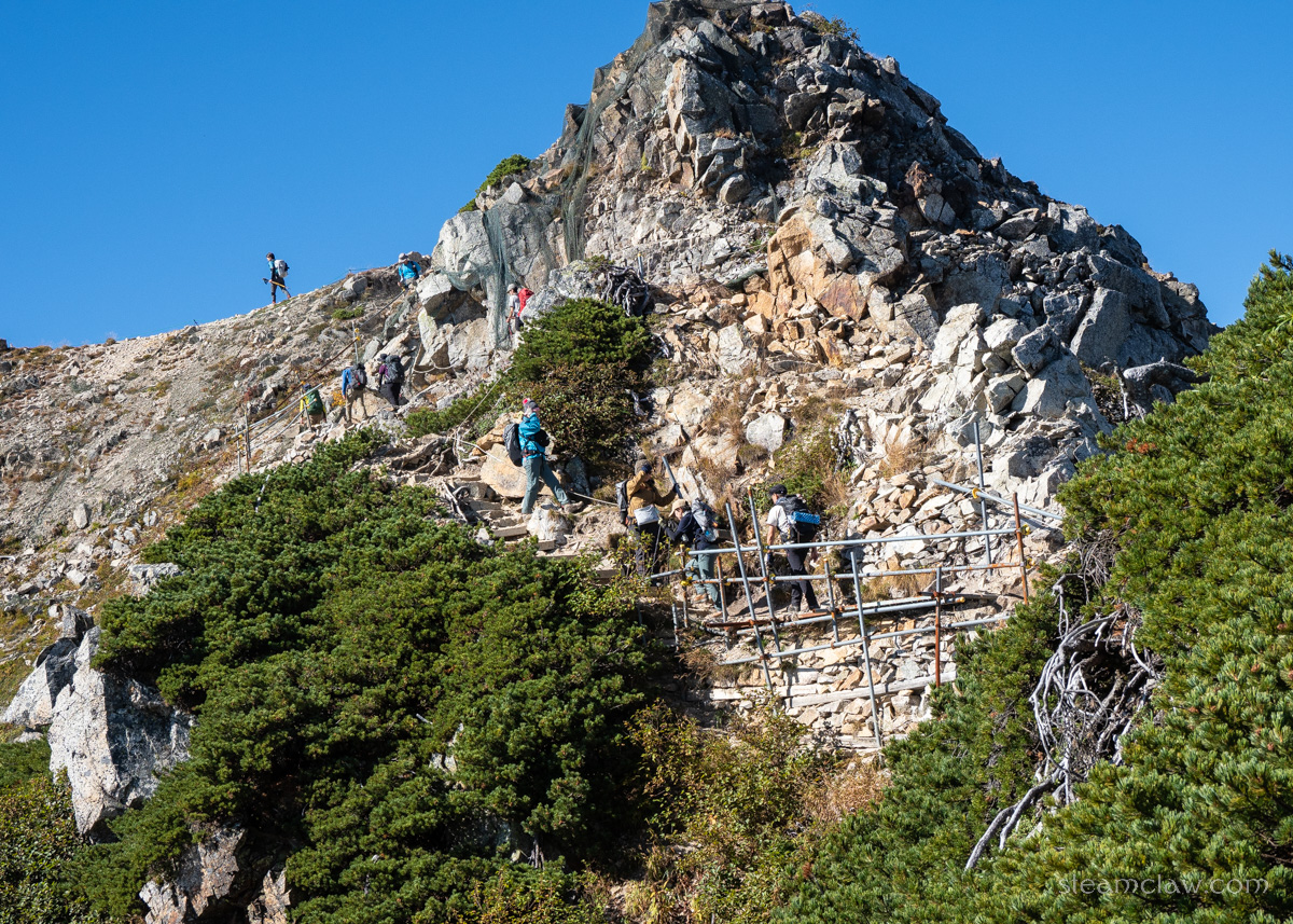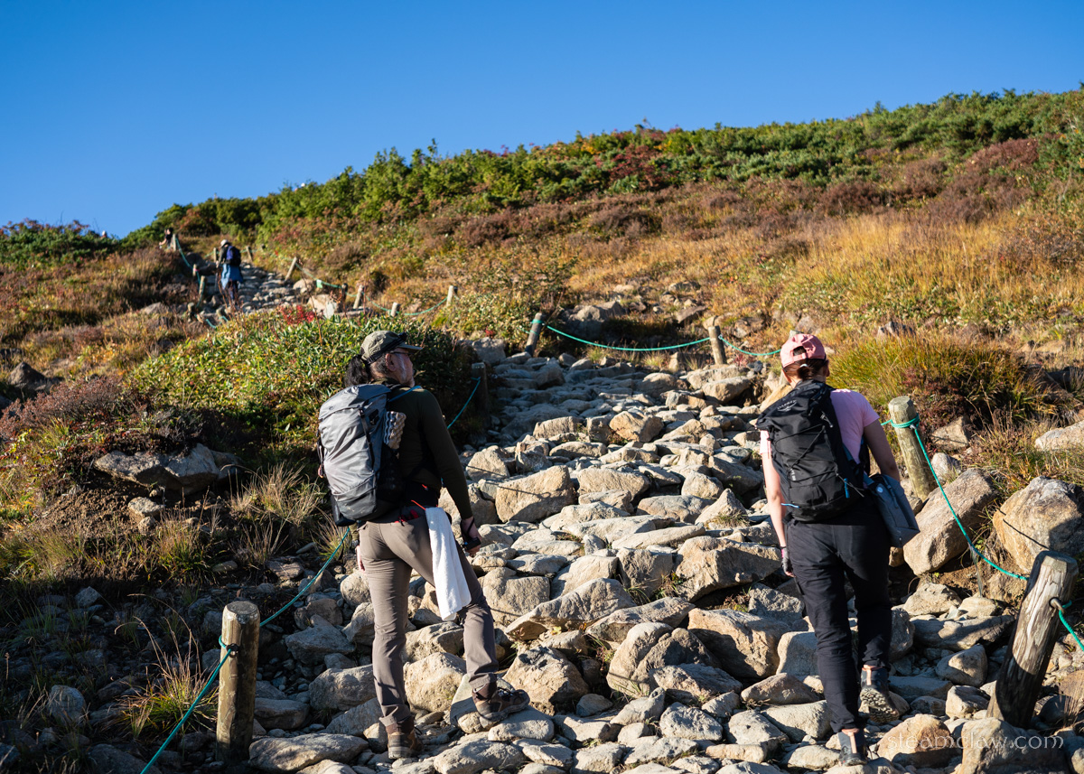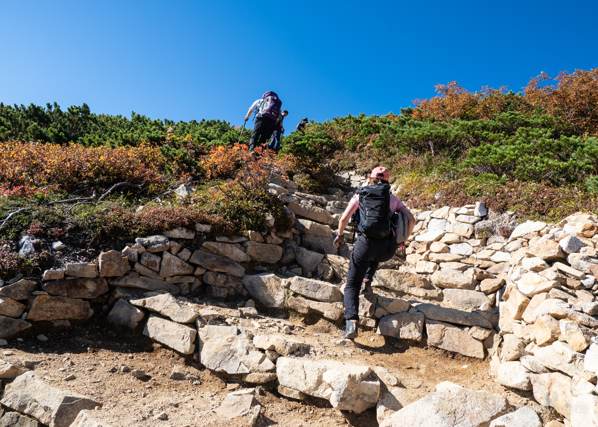 もう八方池ははるか後方で、扇雪渓も通過してきているので、既にここは観光地という扱いではないと思うのですが、相変わらず登山道は非常によく整備されているんですよね。3~4人が並んで歩けるのではという道幅に、ドッシリした石の階段と、非常に快適です。