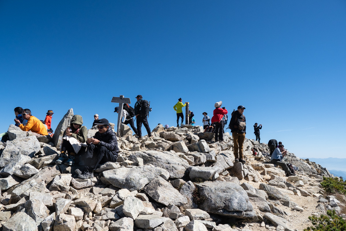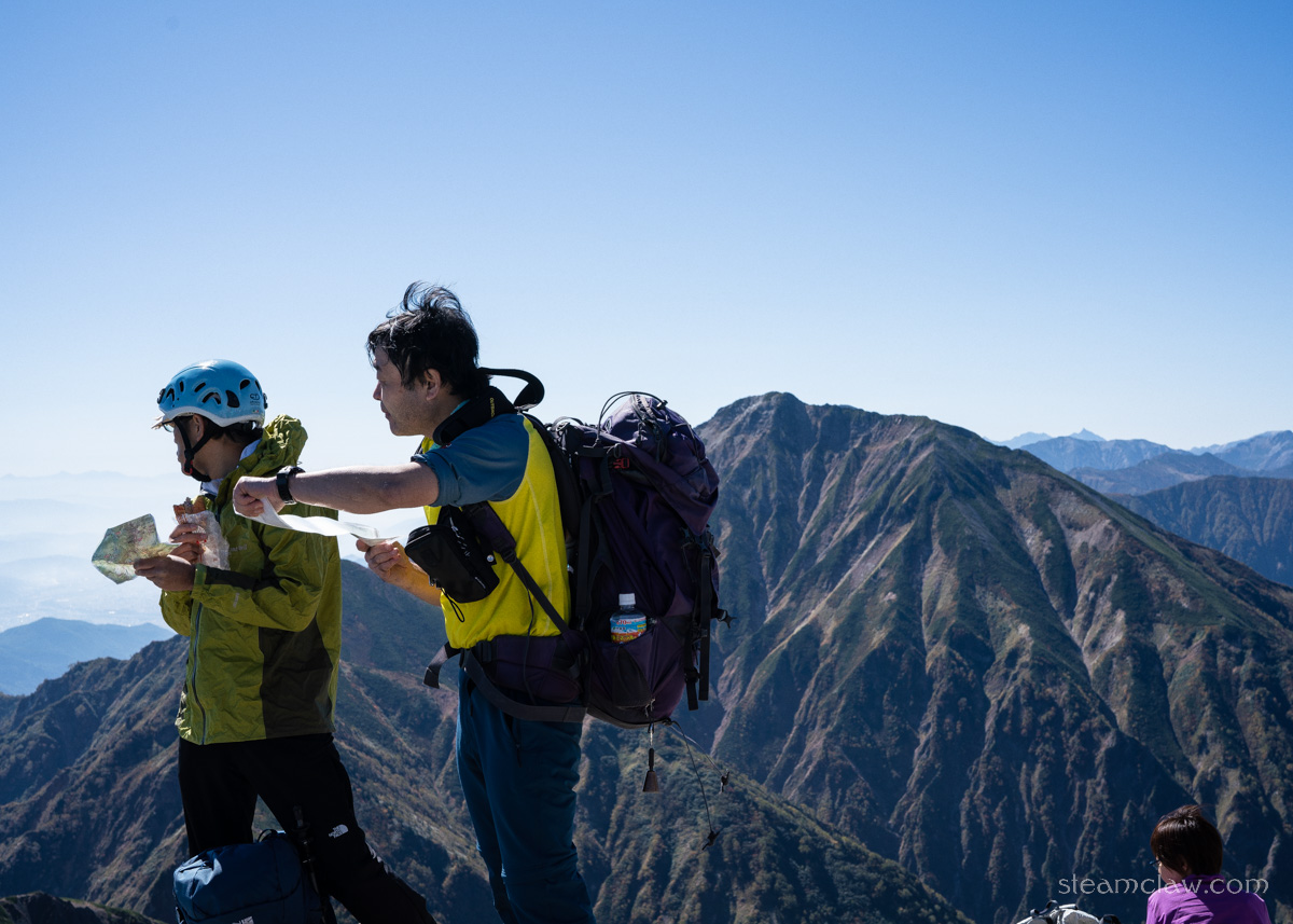唐松岳山頂は結構ガレていますが、多少の広さはあるので少人数グループであれば(この標高の山としては)休憩しやすい部類に入るのではないかなと思います。この日は北側から風が吹き付けてきていたので、山頂北側ではちょっと寒さを感じましたが、昼休憩くらいなら我慢できる程度でした。