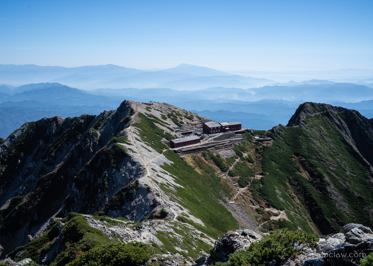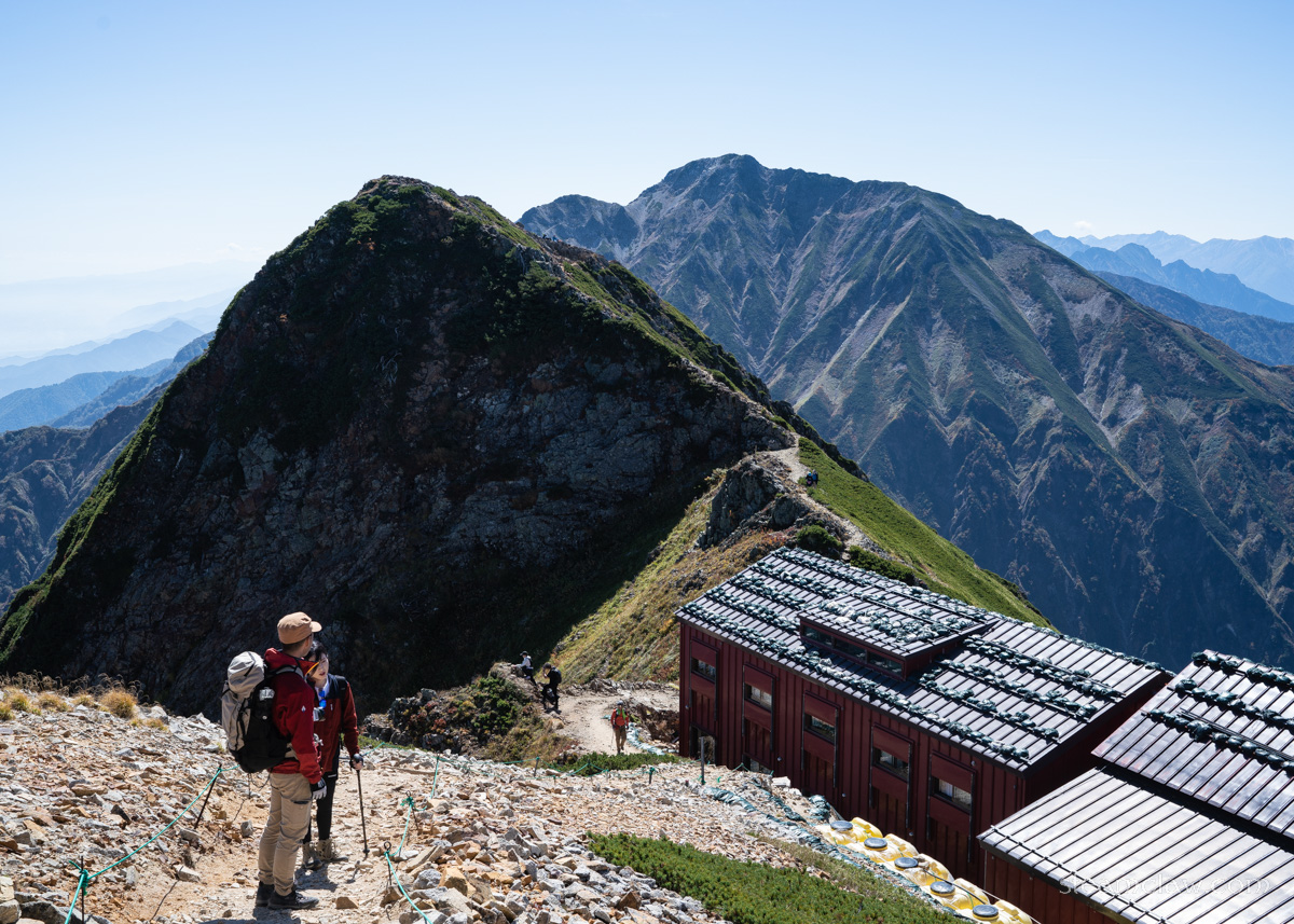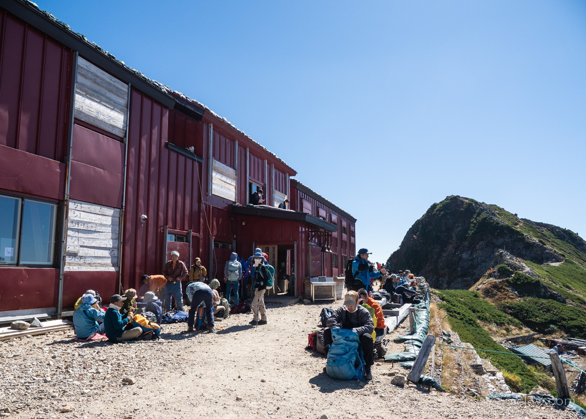 尾根上をひときわ高い小ピークまで登っていくと、唐松岳頂上山荘に到着。ここまで3時間ちょっとと、やや早めのペースで登ってきましたが、特に疲れを感じるようなことはなく、まだまだ頑張れる体力が残っています。さすが北アルプスの中では初心者向けとされるだけありますね。