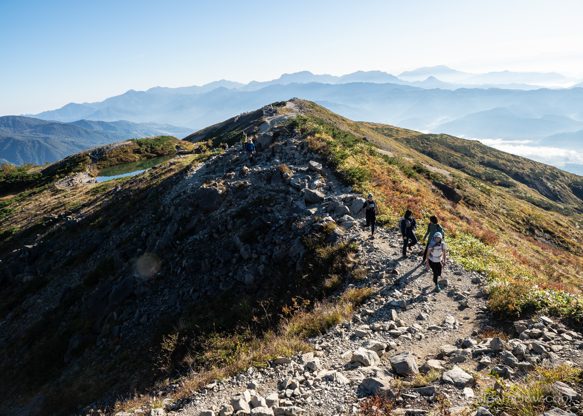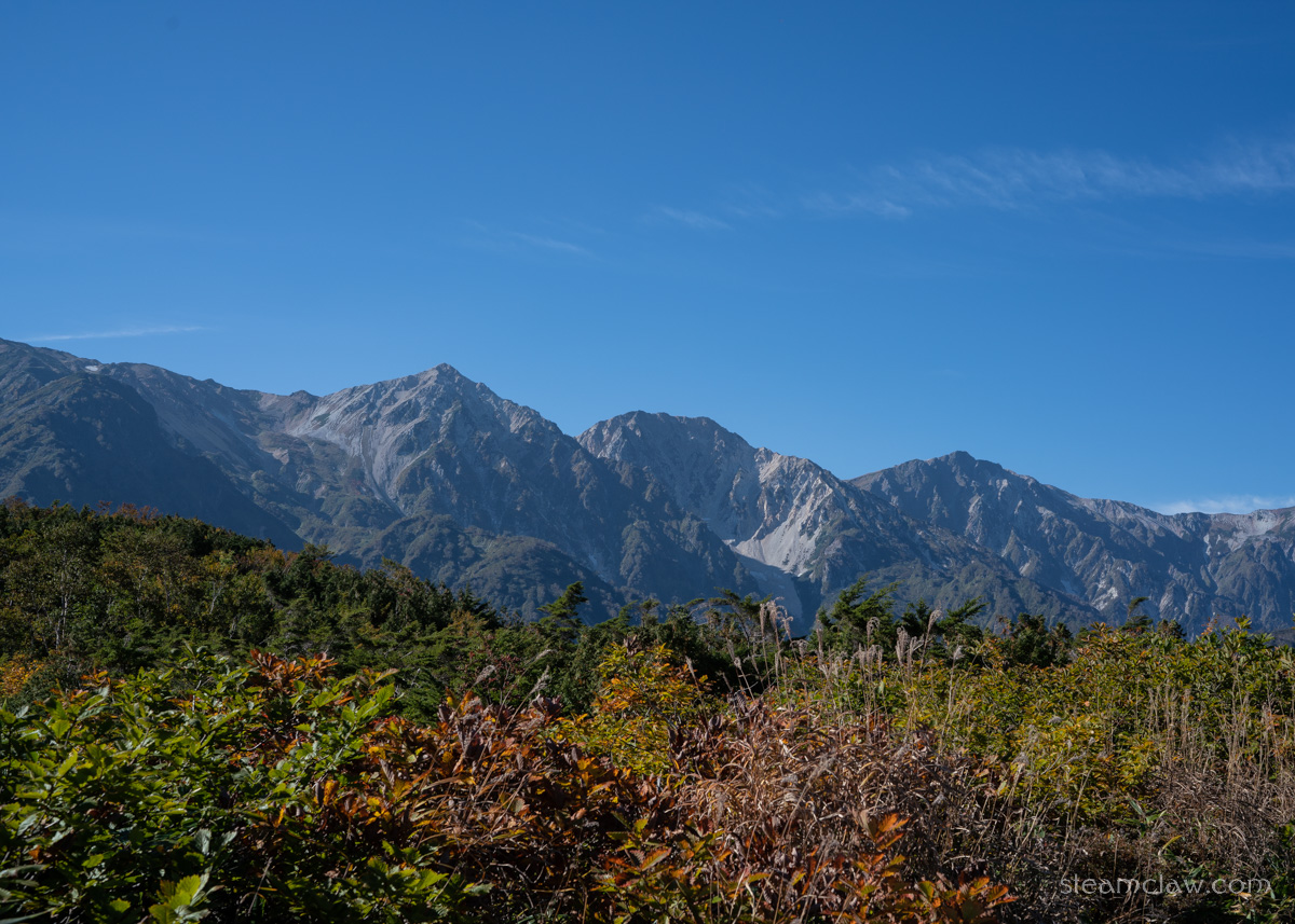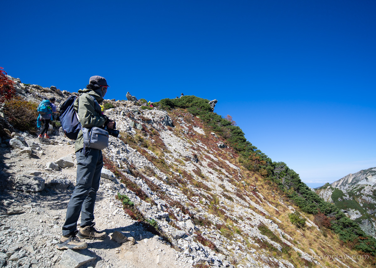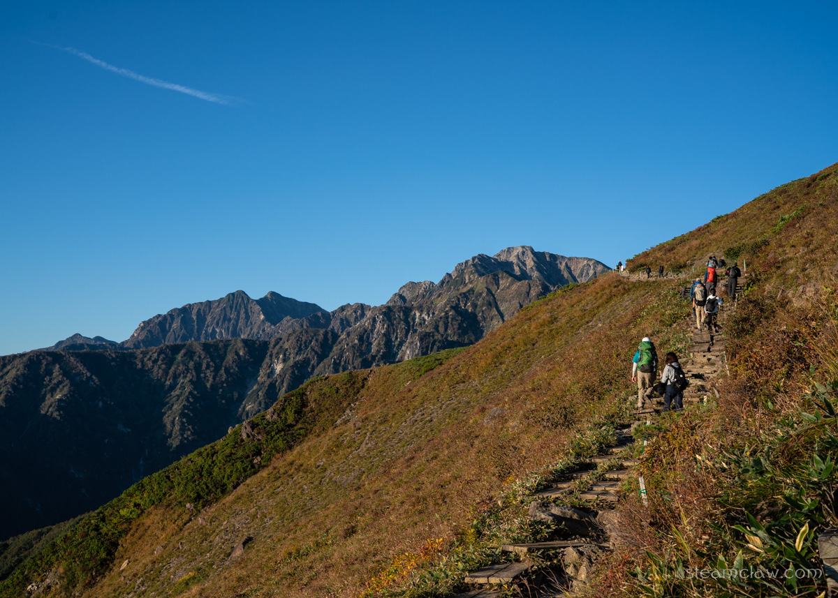 出発時は東方に薄雲がところどころかかっていましたが、これから登っていく西方、後立山連峰方面はどこを向いてもスカッとした青空。10月の朝方ということで気温も涼しく、快適に登っていくことができます。