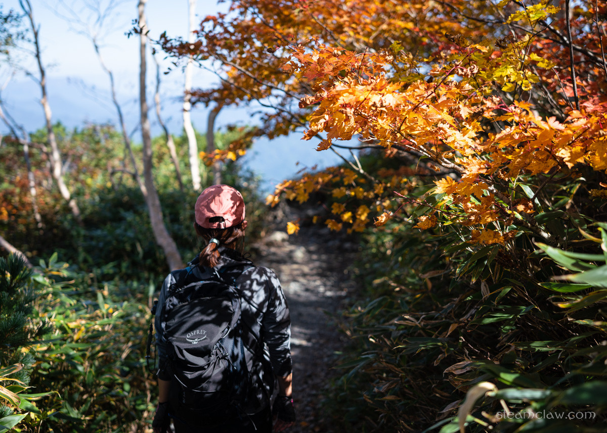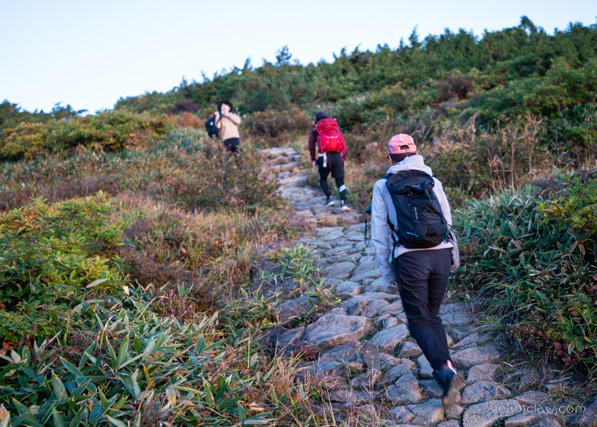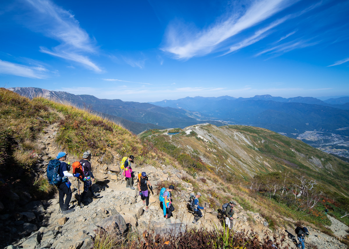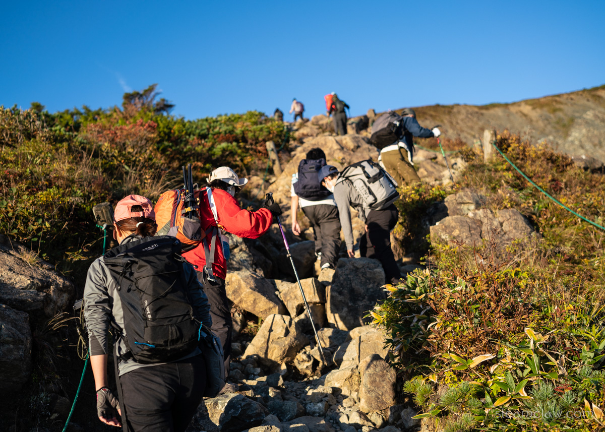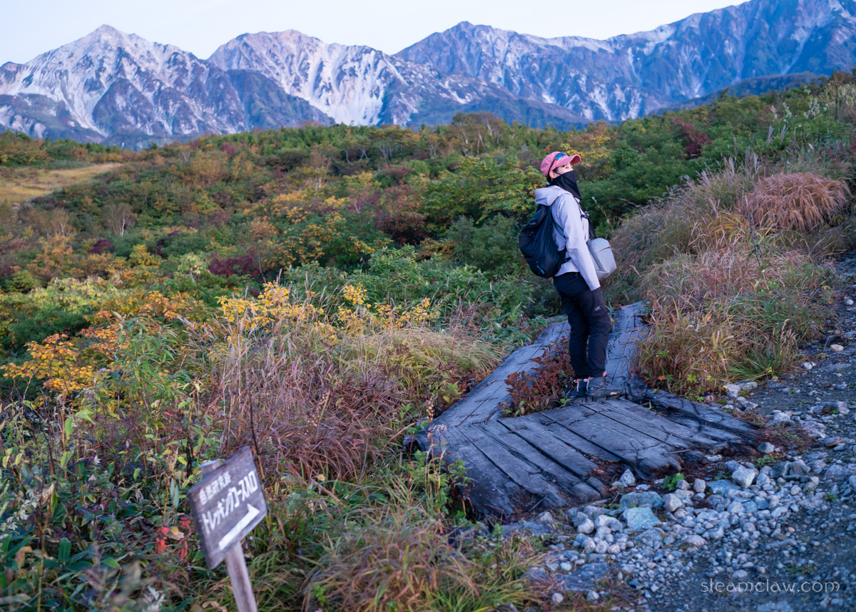 出発時は東方に薄雲がところどころかかっていましたが、これから登っていく西方、後立山連峰方面はどこを向いてもスカッとした青空。10月の朝方ということで気温も涼しく、快適に登っていくことができます。