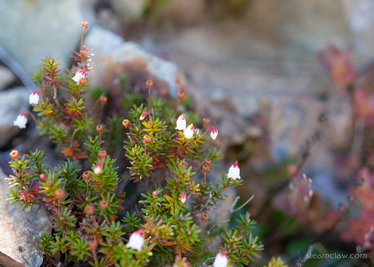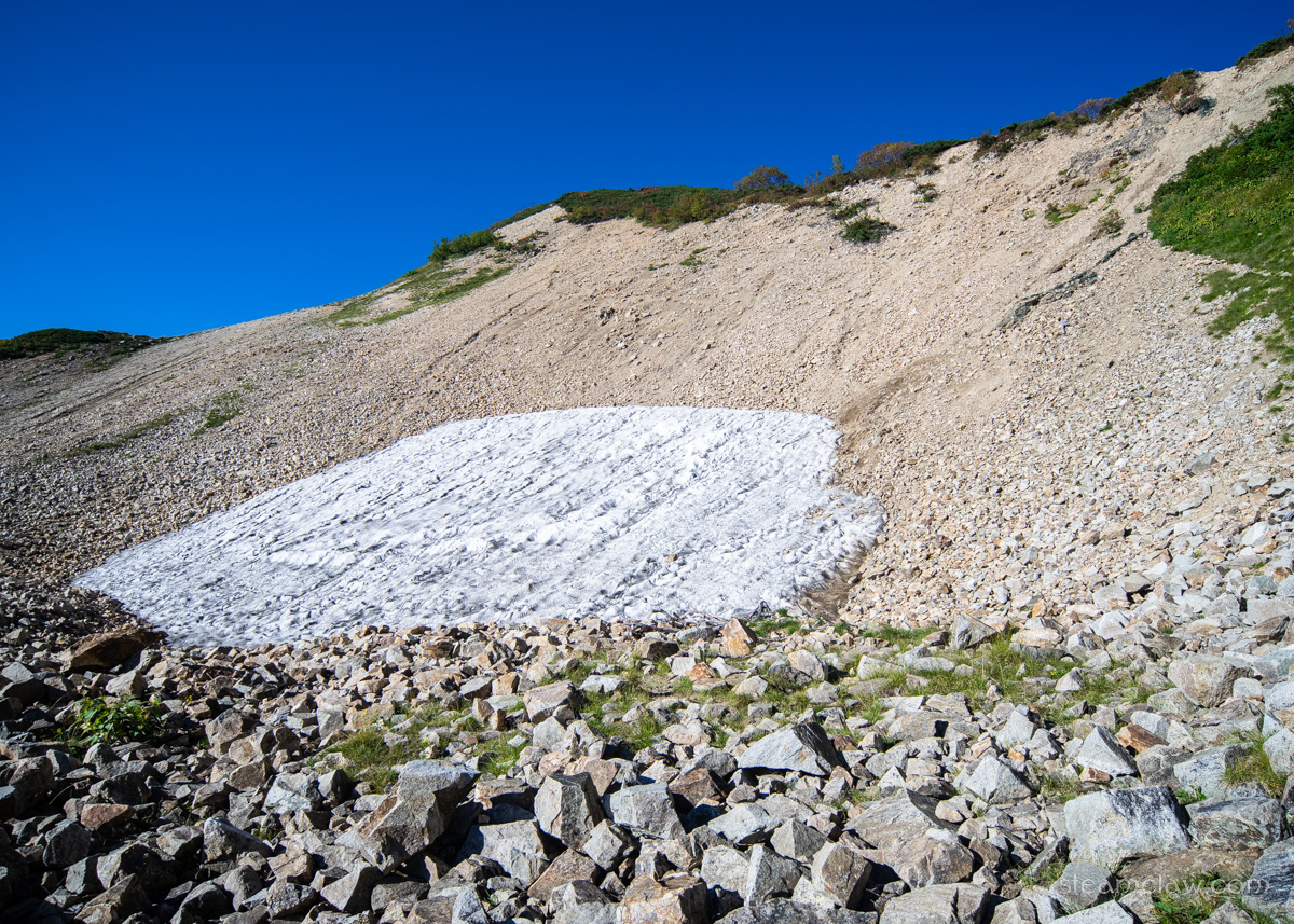 ややハードな登山道を登っていくと扇雪渓へ。時期によってはもっとドッサリ雪が残っているようですが、秋も終盤を迎えたこの日はチンマリとした雪の塊が残っている程度。冬になって再び積雪があるまでに消えてしまうのではと心配になってしまいます。温暖化が進んだら、いつかは本当に無くなってしまうかもしれませんね…