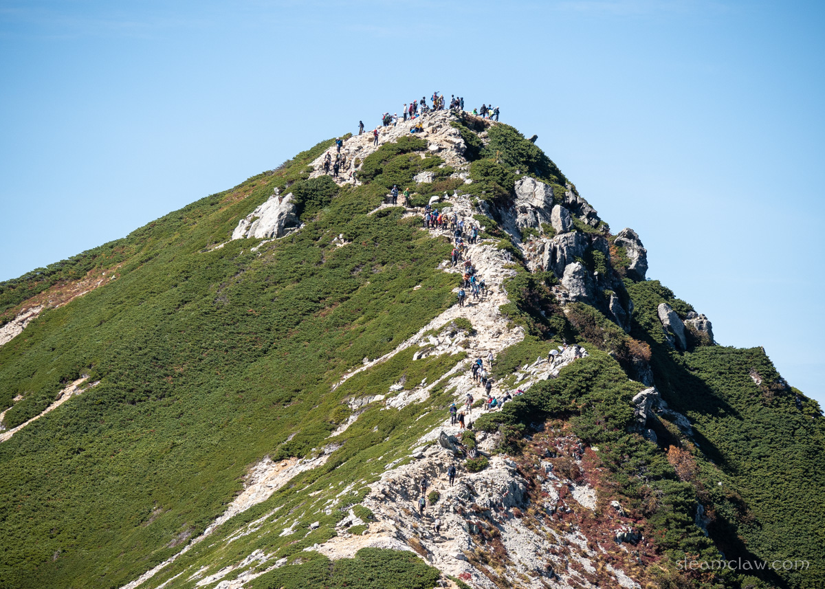 八方尾根を下る前に、唐松岳のほうを振返ってみると、先ほど唐松岳頂上山荘前で休憩していたハイカー集団が登頂しはじめたのか、それとも遅れてスタートした公共交通機関組が到着しはじめたのか、かなり混雑しているのが見えました。