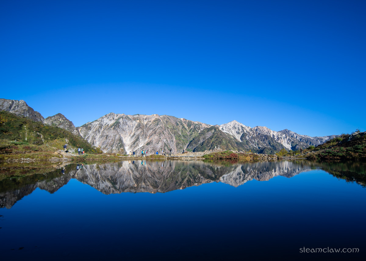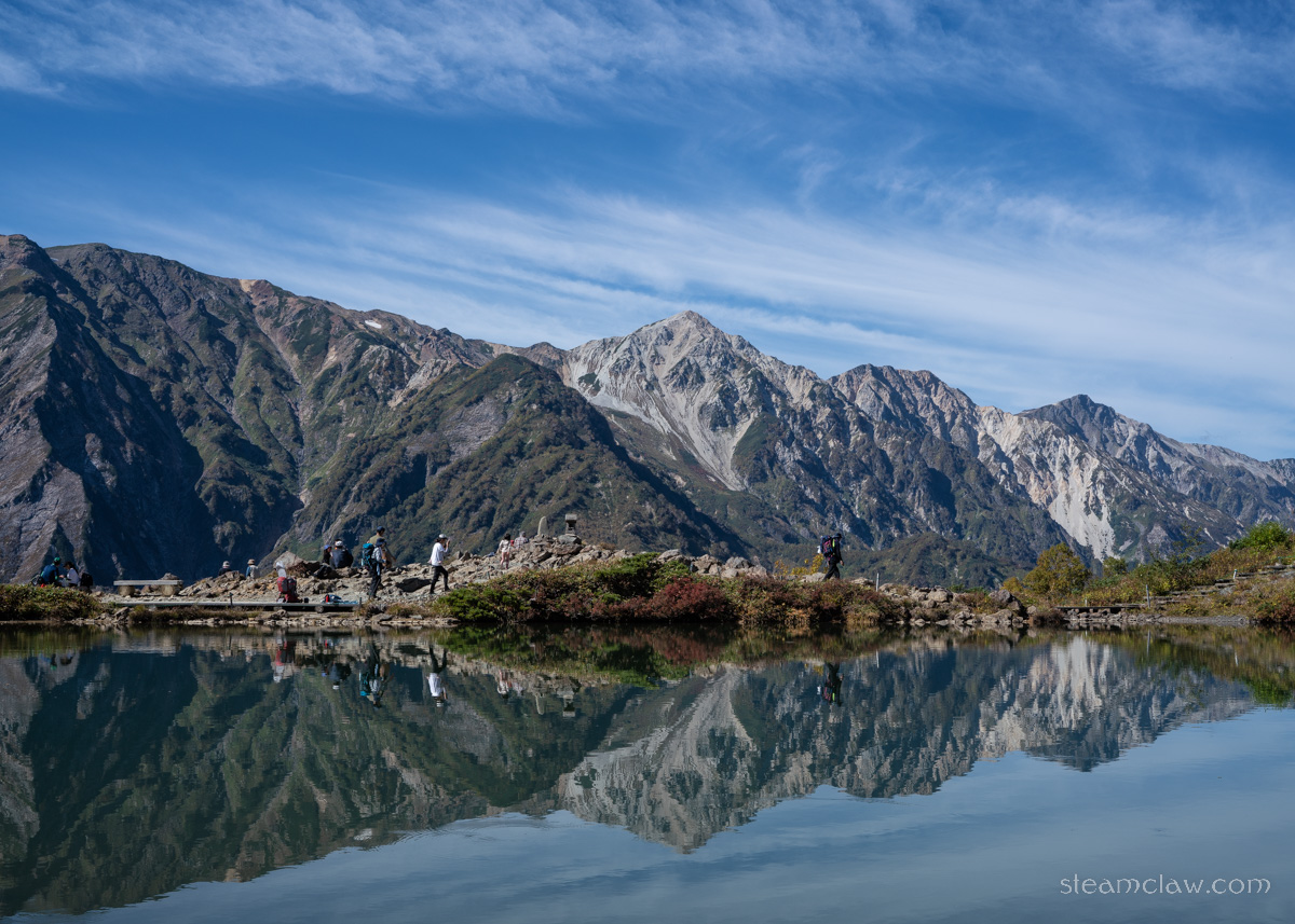 - 八方池では水面に白馬三山が映りこむ景勝が楽しめる