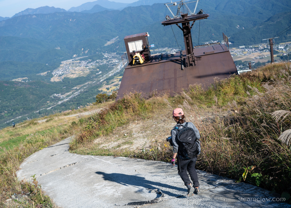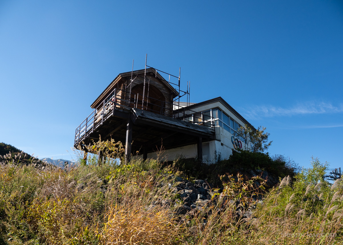 黒菱第三ペアリフトに乗って5分ちょっとでしょうか。黒菱平に到着。ここには1998年長野オリンピックのスキー競技で使われた施設が残されており、ところどころにオリンピックロゴを見ることができます。スキーは詳しくないのですが、この黒菱ゲレンデは難易度の高いコブ斜面となっており、白馬八方尾根スキー場の名物なのだとか。
