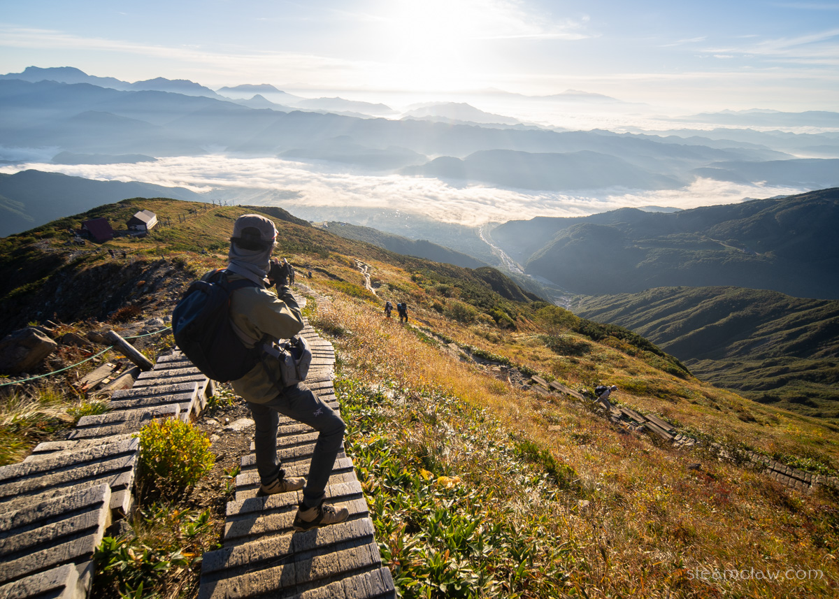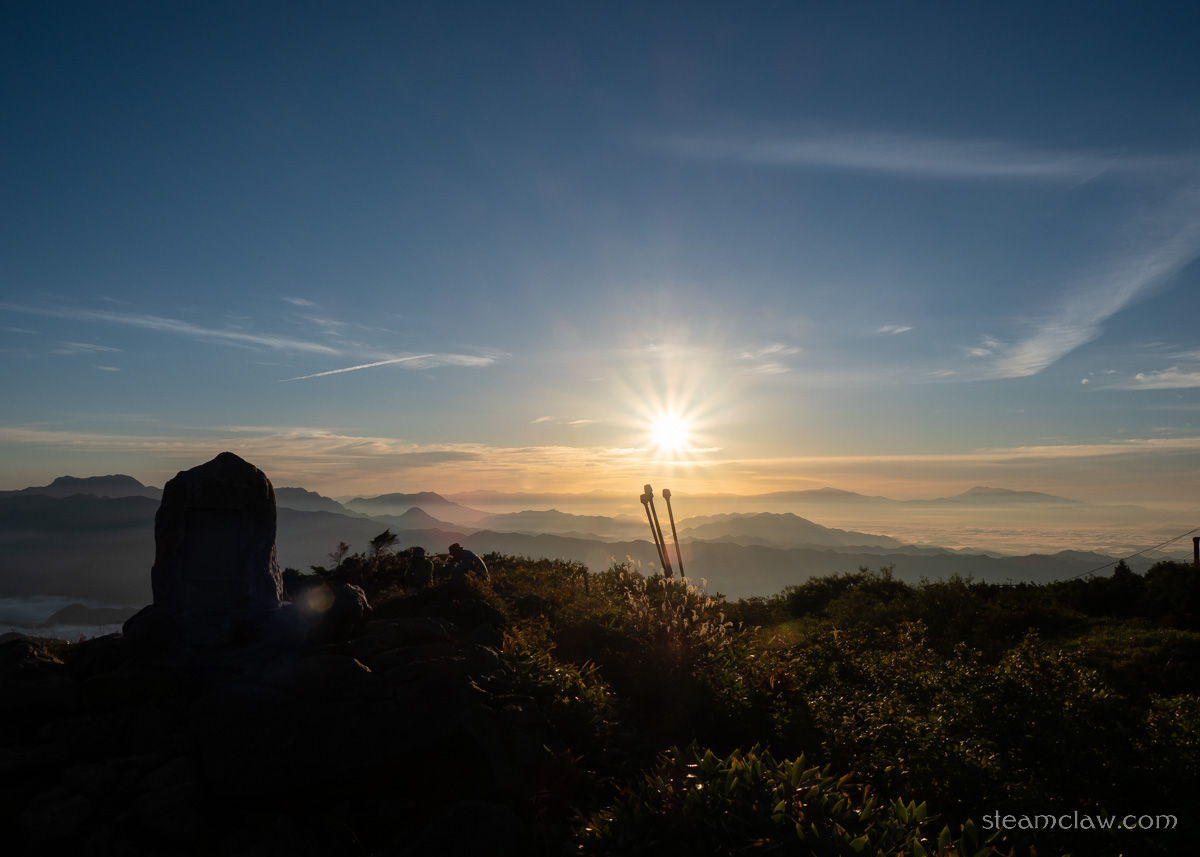 黒菱平から八方池山荘まではなだらかな九十九折の登山道。中ほどまで登ったところで御来光を迎えることができました。前日夜から白馬村には濃霧が立ち込めており、それが雲海となって広がっています。もう少しうえの方まで広がっていれば良かったんですけど、贅沢は言えないか。