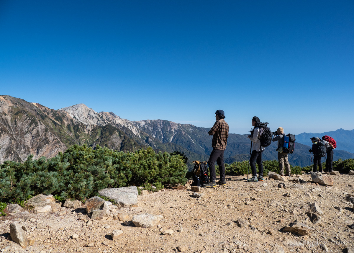 ここからは今まで唐松岳に隠れてみえなかった剱岳、立山、毛勝三山などがよく見えます。この日は立山方面も天気がよく「今日は立山のほうも沢山登ってるんだろうな」「いずれ行きたい」などと話しながら山頂へ向かいます。
