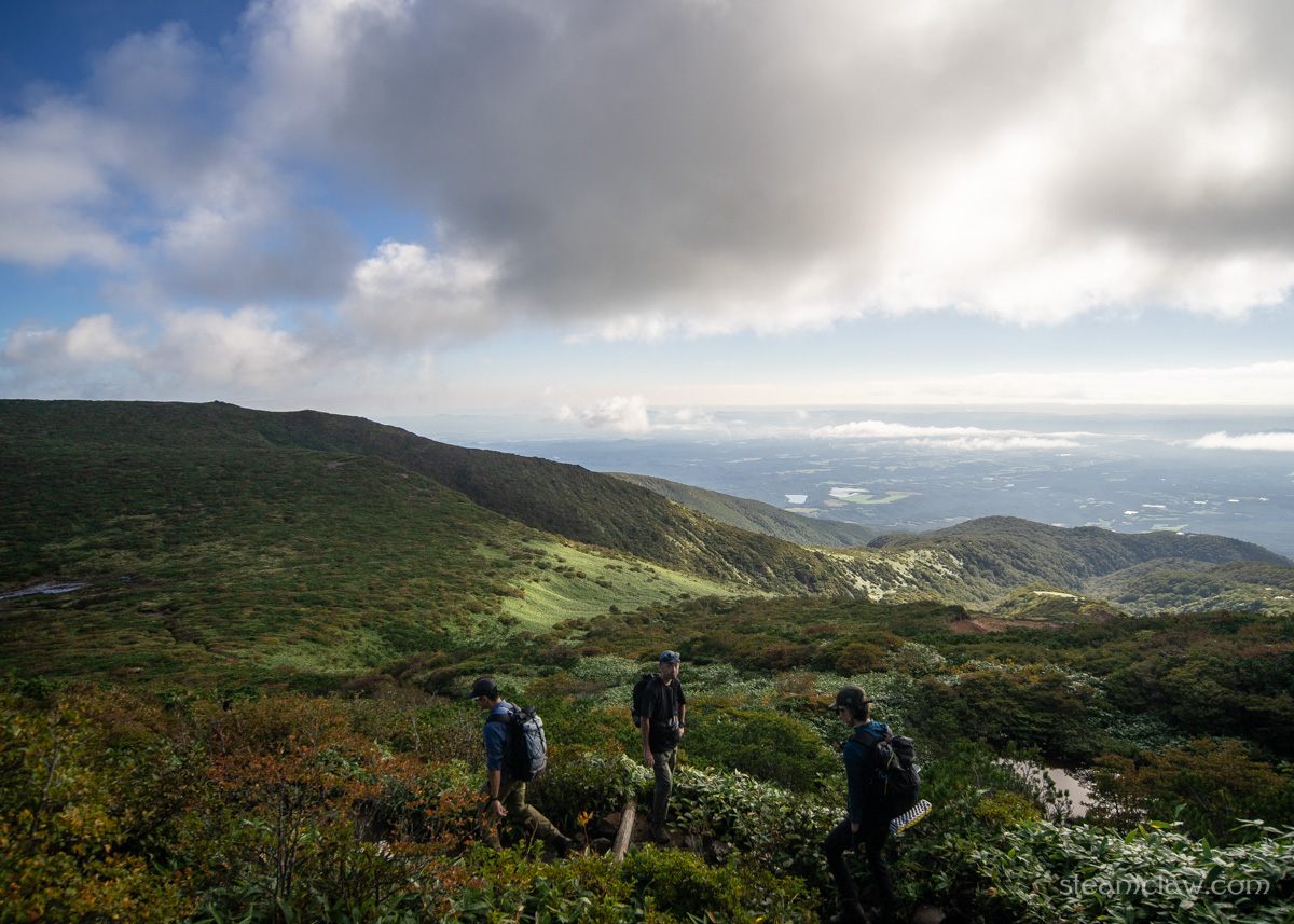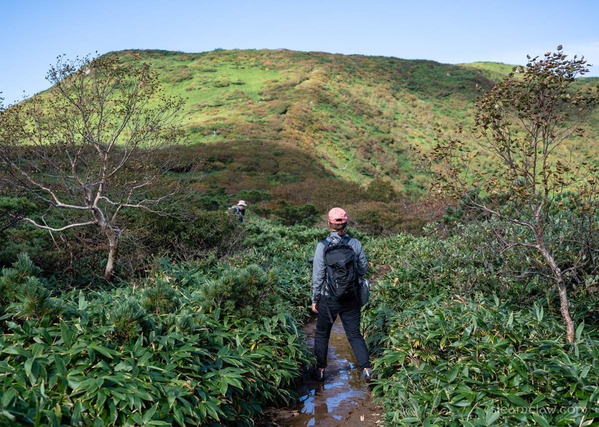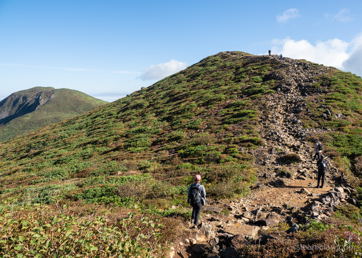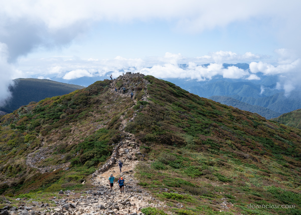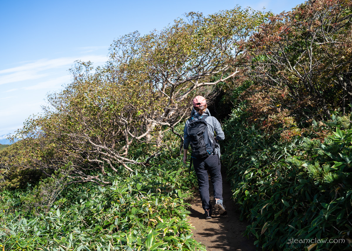 分岐から先、清水平手前くらいまではアルプスなどの高山を彷彿とさせるハイマツなど灌木帯の稜線で、快適なハイキングを楽しむことができますね。さすがに標高がまるで違うのでアルプスのような高度感はありませんが、緩やかにうねる稜線を歩いていくのはまさに登山の醍醐味です。