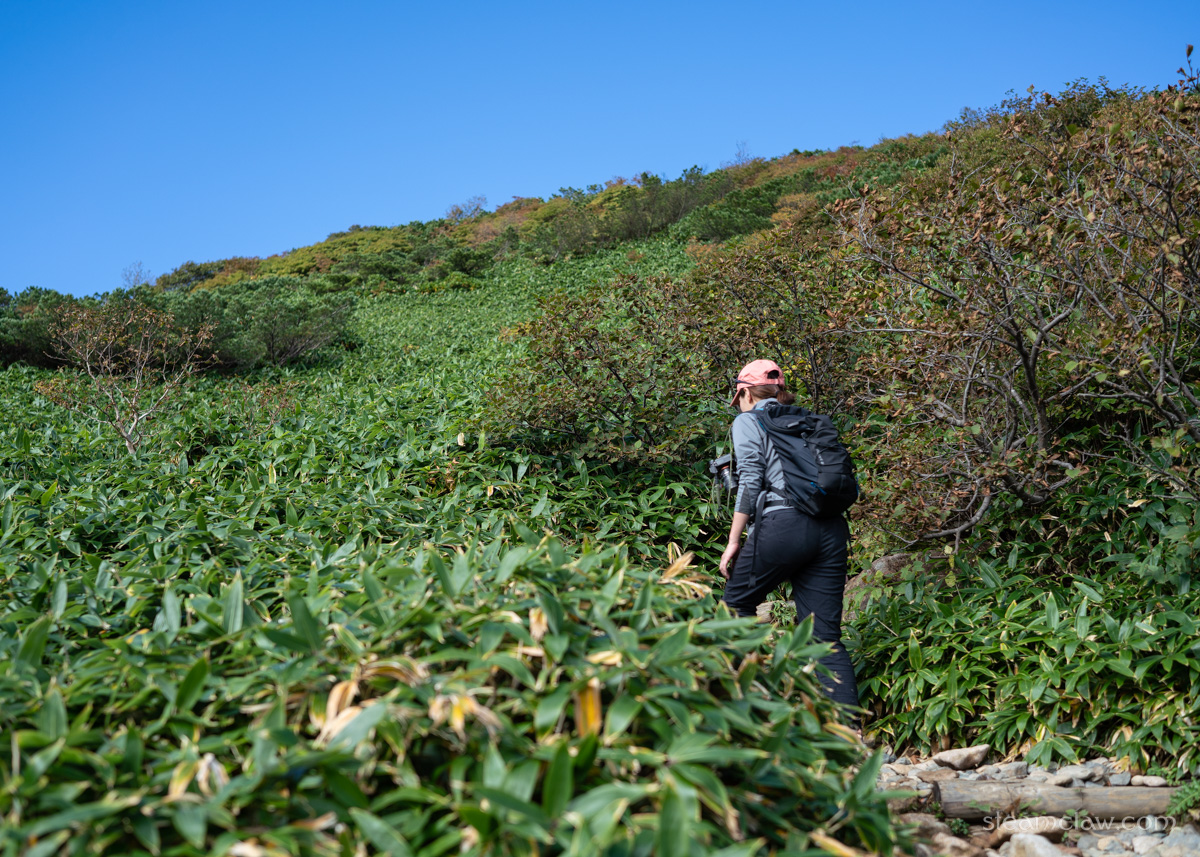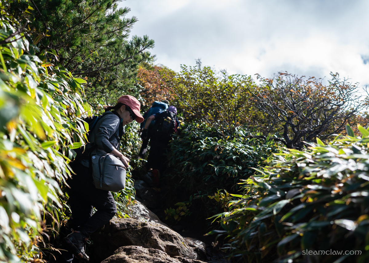 登山道のほうは、気持ちの良い稜線歩きだった清水平までとは打って変わって、背丈ほどあるササや灌木のなかを通り抜けていくという、やや地味な区間となっています。さらに前日の雨で足元がだいぶ泥濘んでおり、ところどころ苦労しながら通過。