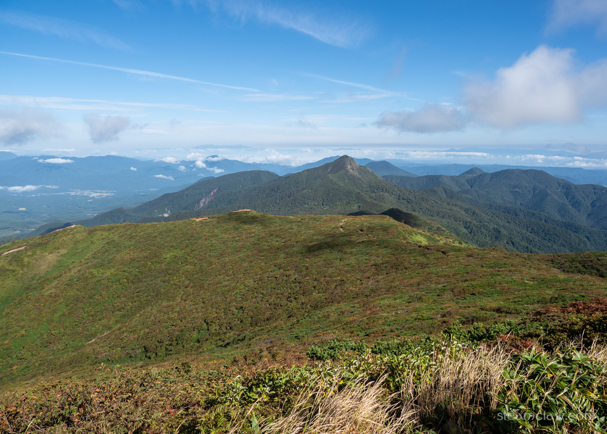 分岐を右に進むと、緩やかなアップダウンで幾つかの小ピークを踏んでいきます。まずは分岐から15分ほどの熊見曽根分岐。あまり嬉しくない名前ですが、この分岐で尾根筋を外れると熊見曽根をへて那須岳エリアの活動拠点となる三斗小屋温泉へ下降することができます。