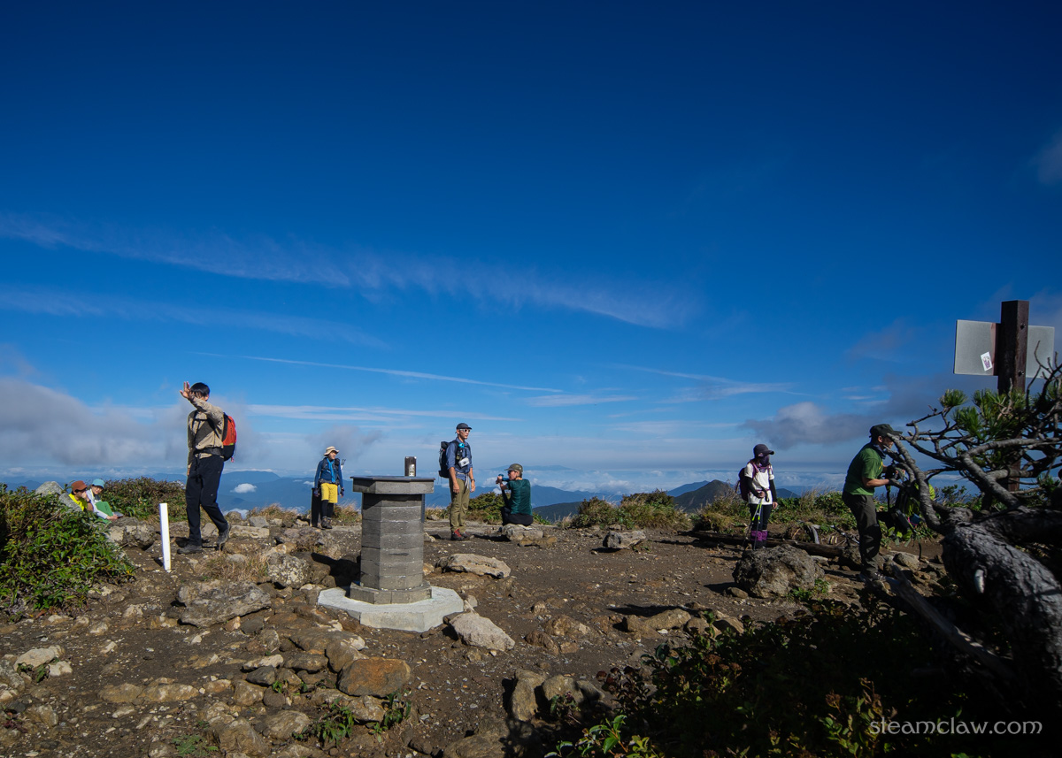 平たい印象の三本槍岳ですが、山頂の大部分は笹に覆われており、休憩に使えるスペースは三角点や山頂標識の周辺のみ。とはいえ茶臼岳や朝日岳と比べるとハイカーの数が少ないので、のんびり休憩はしやすいかなと思います。