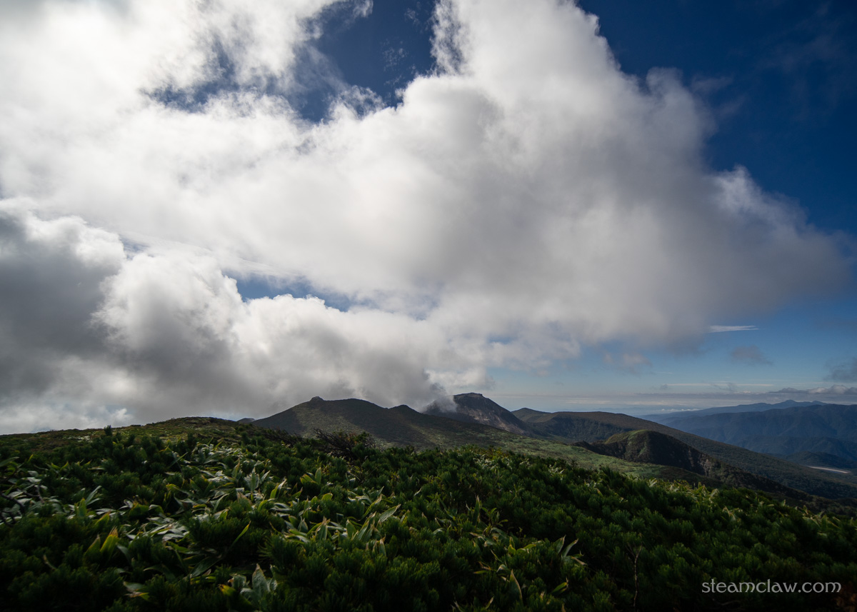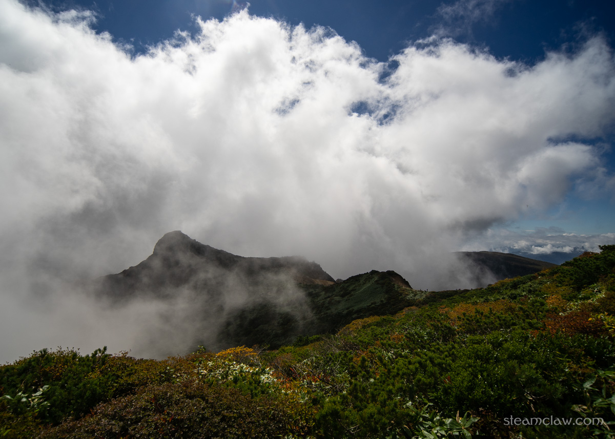 しばらくモグモグやっていましたが、ガスが晴れてくれそうにないので先に進むことに。1,900メートルピークまで進むと、標高が上がったこともあって晴れ間がみえましたが、朝日岳のほうは期待できなさそうな雰囲気。