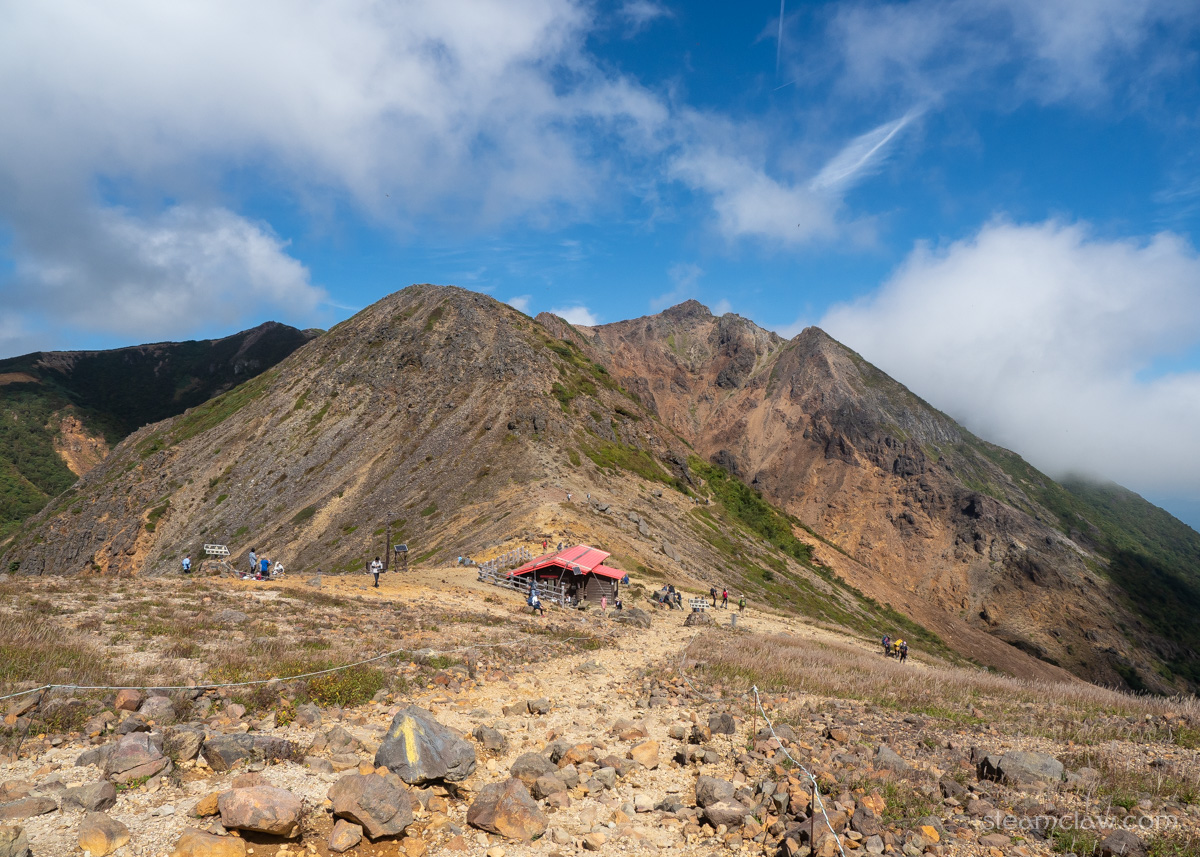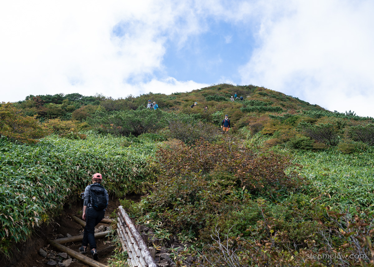 清水平をすぎると、登山道は三本槍岳に向かって最短の直線ルートをとるのではなく、北側にある1850メートル前後の小ピークを登り、マウントジーンズ那須スキー場のゴンドラ山頂駅に下る中ノ大倉尾根への分岐に合流。この中ノ大倉尾根ですが、茶臼岳を絡めず三本槍岳だけ目指すのであれば手頃なルートになるでしょう。