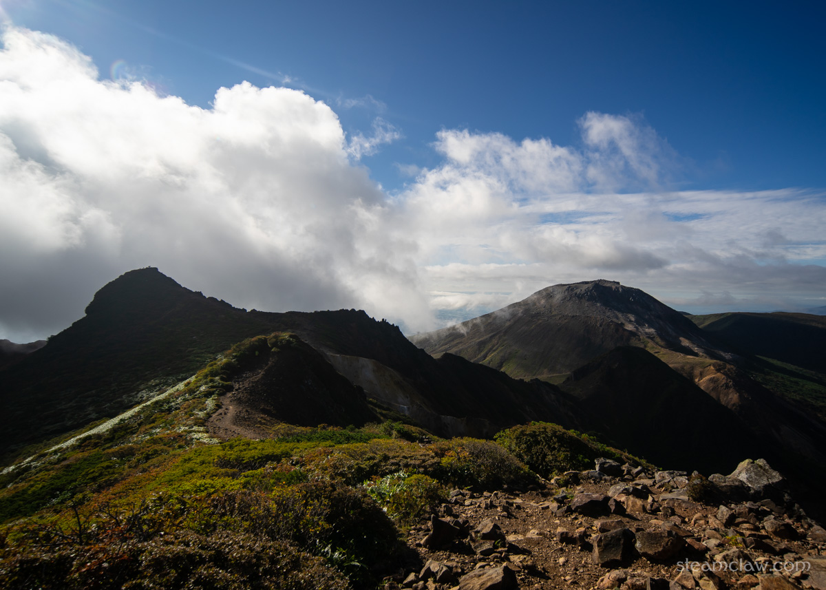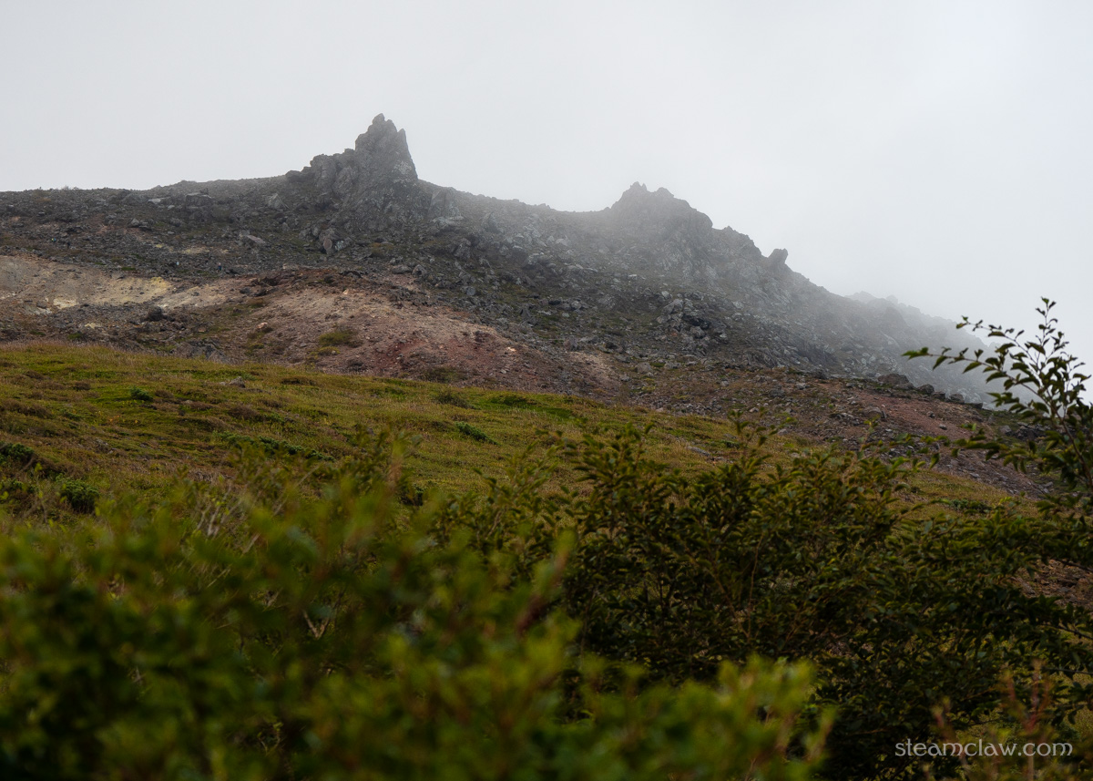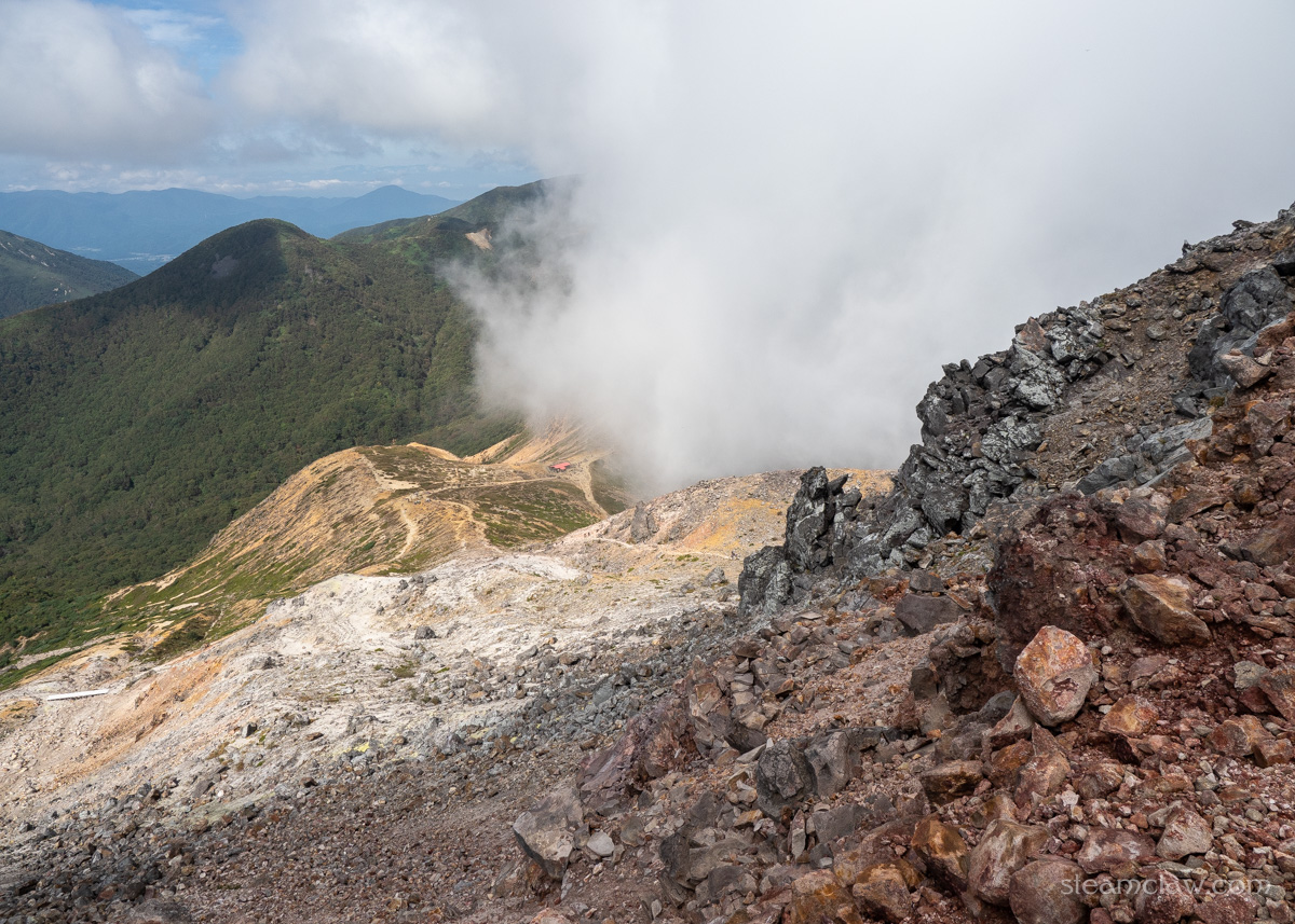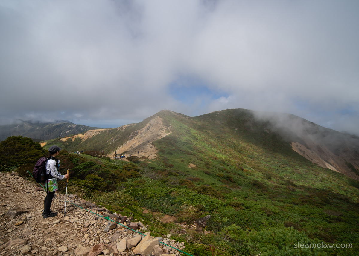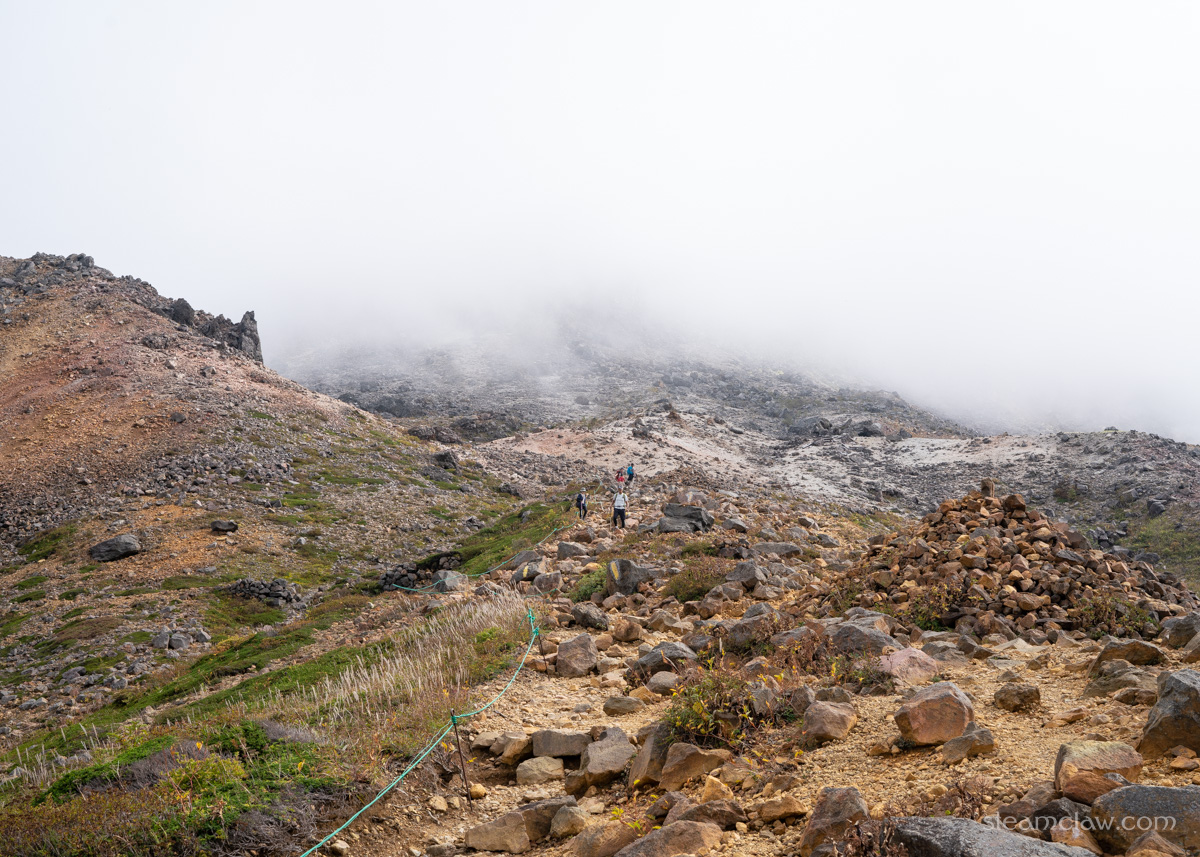 間の悪さを呪う気持ち半分、とはいえガスったままよりはマシだという喜び半分、というところでしょうか。さすがに朝日岳まで戻る時間、体力、気力もないので、ひとまず晴れているうちに茶臼岳登頂してしまおう、ということで先を急ぐことにします。