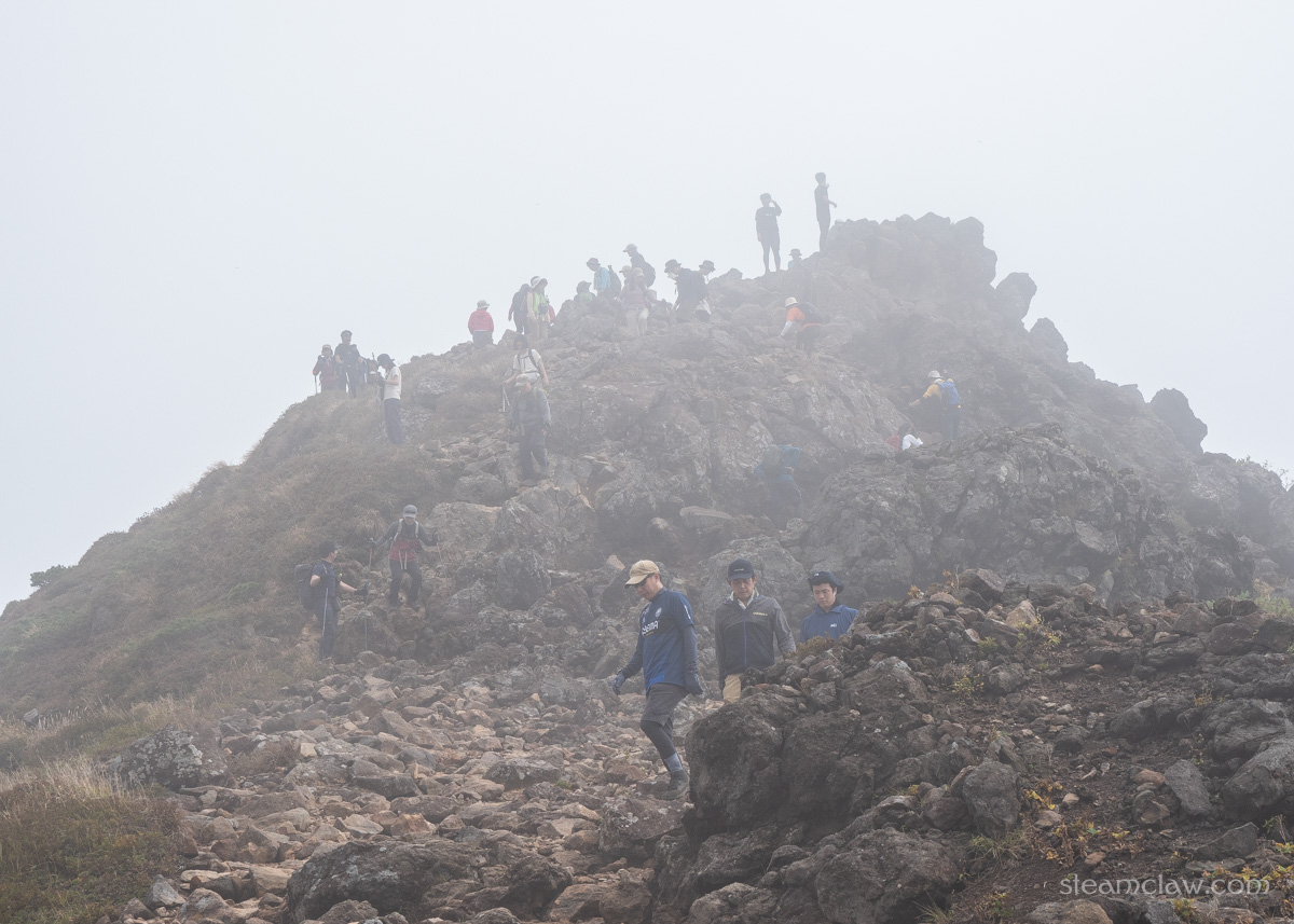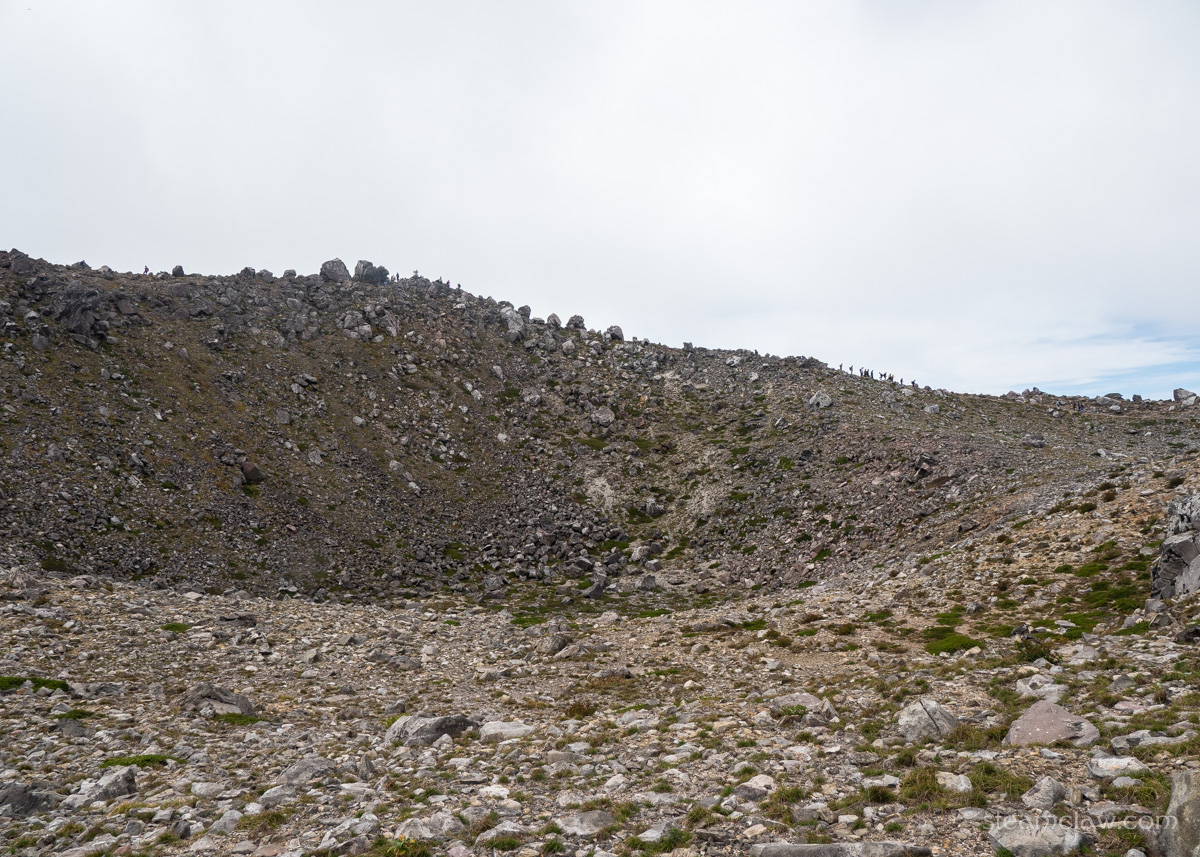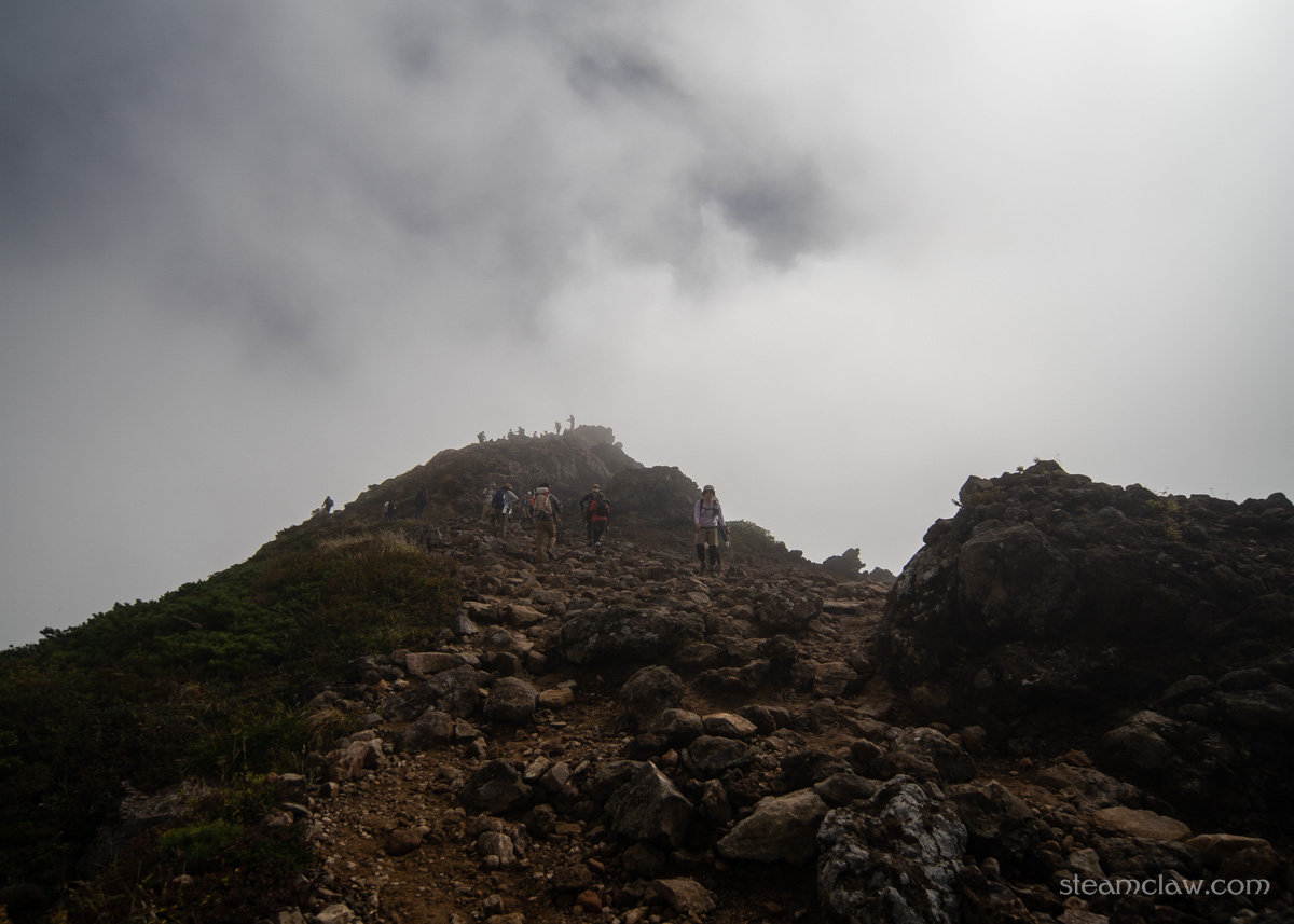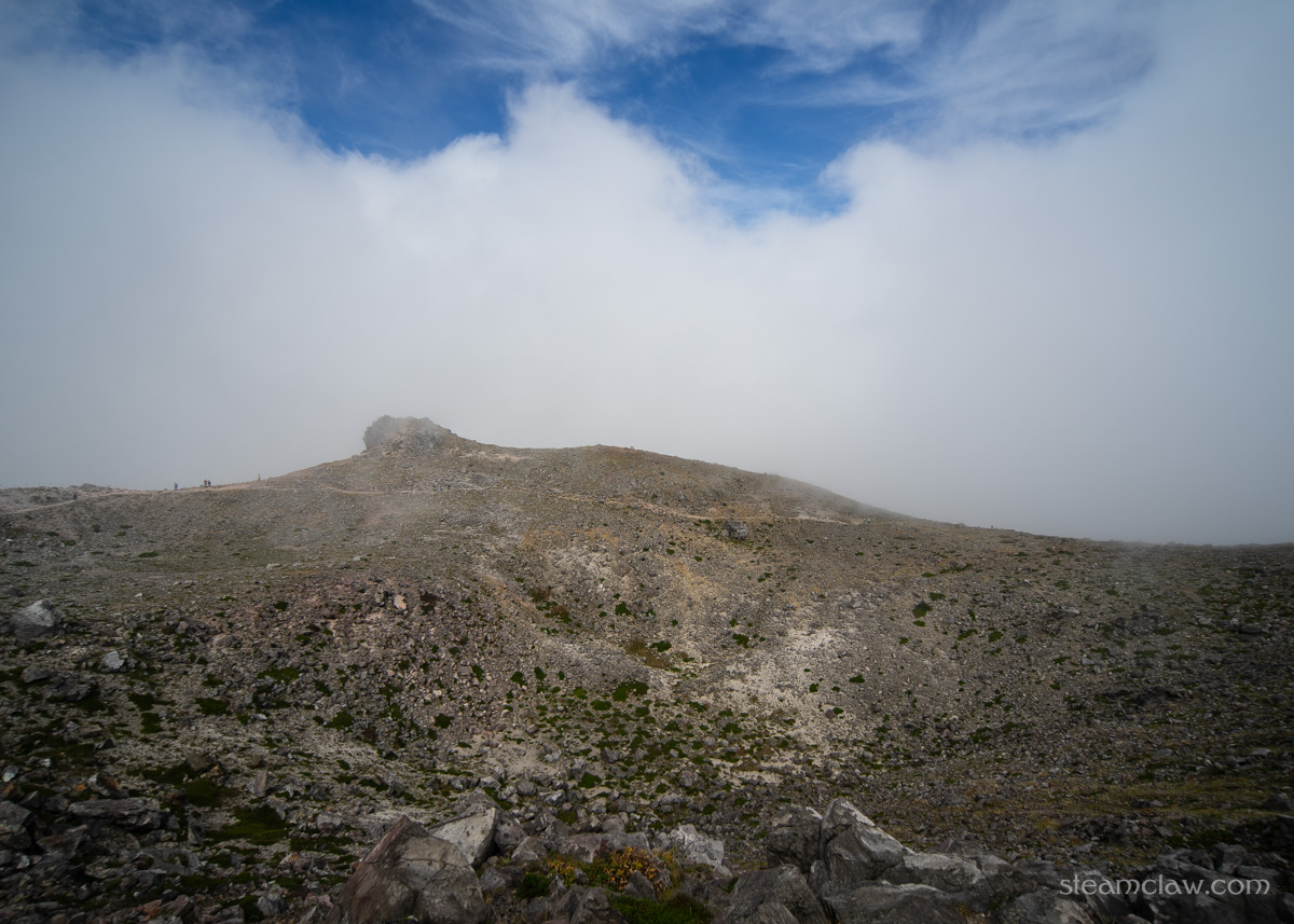 だいぶ疲れがみえてきた嫁さんの休憩を兼ねてお釜口外周で待ってみましたが、吹き上がってくるガスは濃くなる一方で、どうにも天候が回復する見込みはなさそうなので、山頂へ向かうことに。お釜口外周のひときわ高いピークが茶臼岳の山頂です。