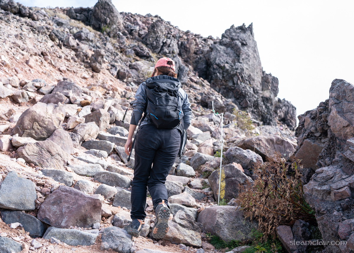 剣ヶ峰を通過すると、登山道は朝日岳の西側山腹を登りはじめます。ガレているというほどでありませんが、石礫がそこらに転がっており、ここまでで初めての登山道らしい登山道でしょうか。登山道が左にカーブしていく踊り場から茶臼岳がバッチリ見えますので、見逃さないよう注意です。