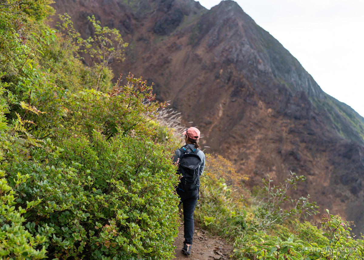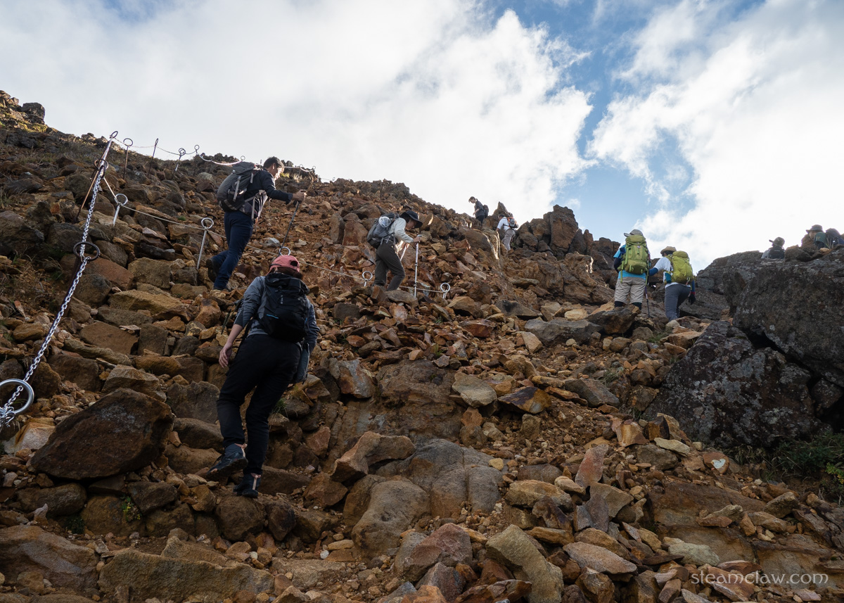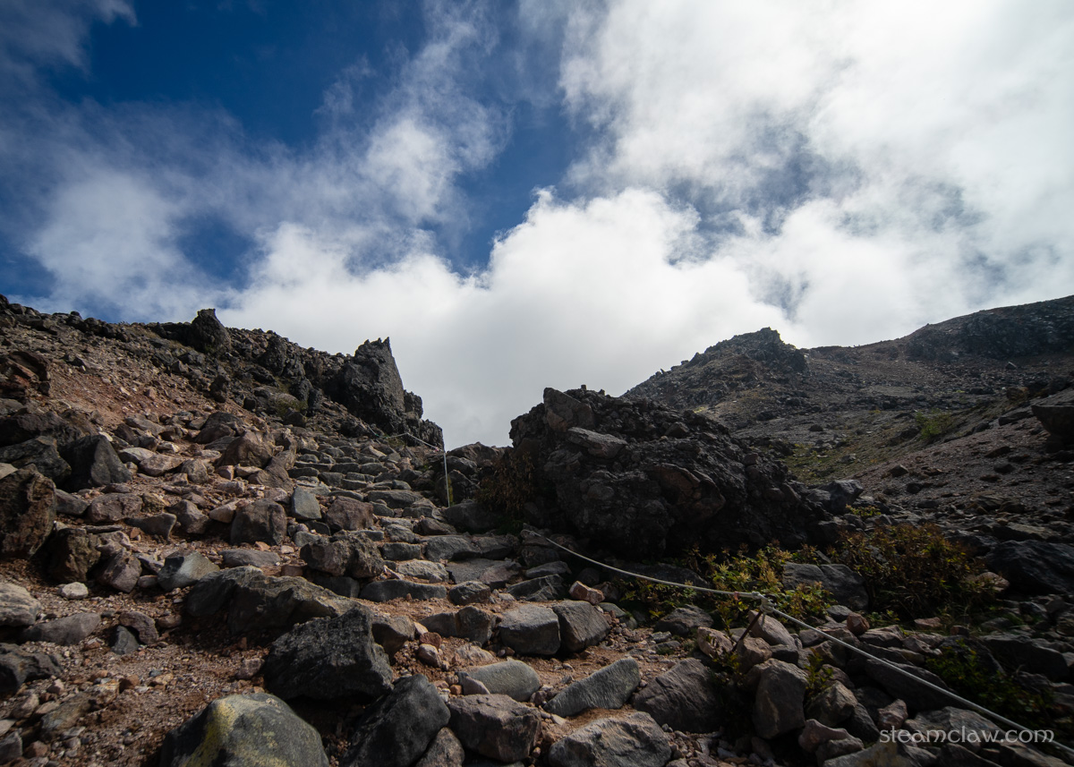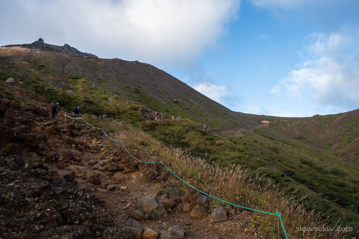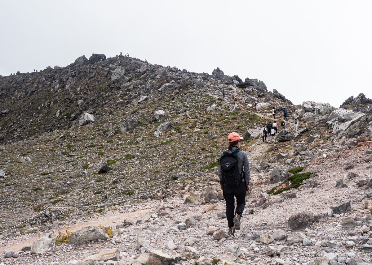 峰ノ茶屋を茶臼岳に向かって直進。分岐から茶臼岳山頂までは30分ちょっと。ほぼ全体を通してなだらかな登りが続いていきます。お釜口の手前だけ少し傾斜がキツくなりますが、適切な装備さえあれば初心者でも登りやすいルートだと思いますね。ただ、嫁さんは寝不足だとかでペースダウン💦
