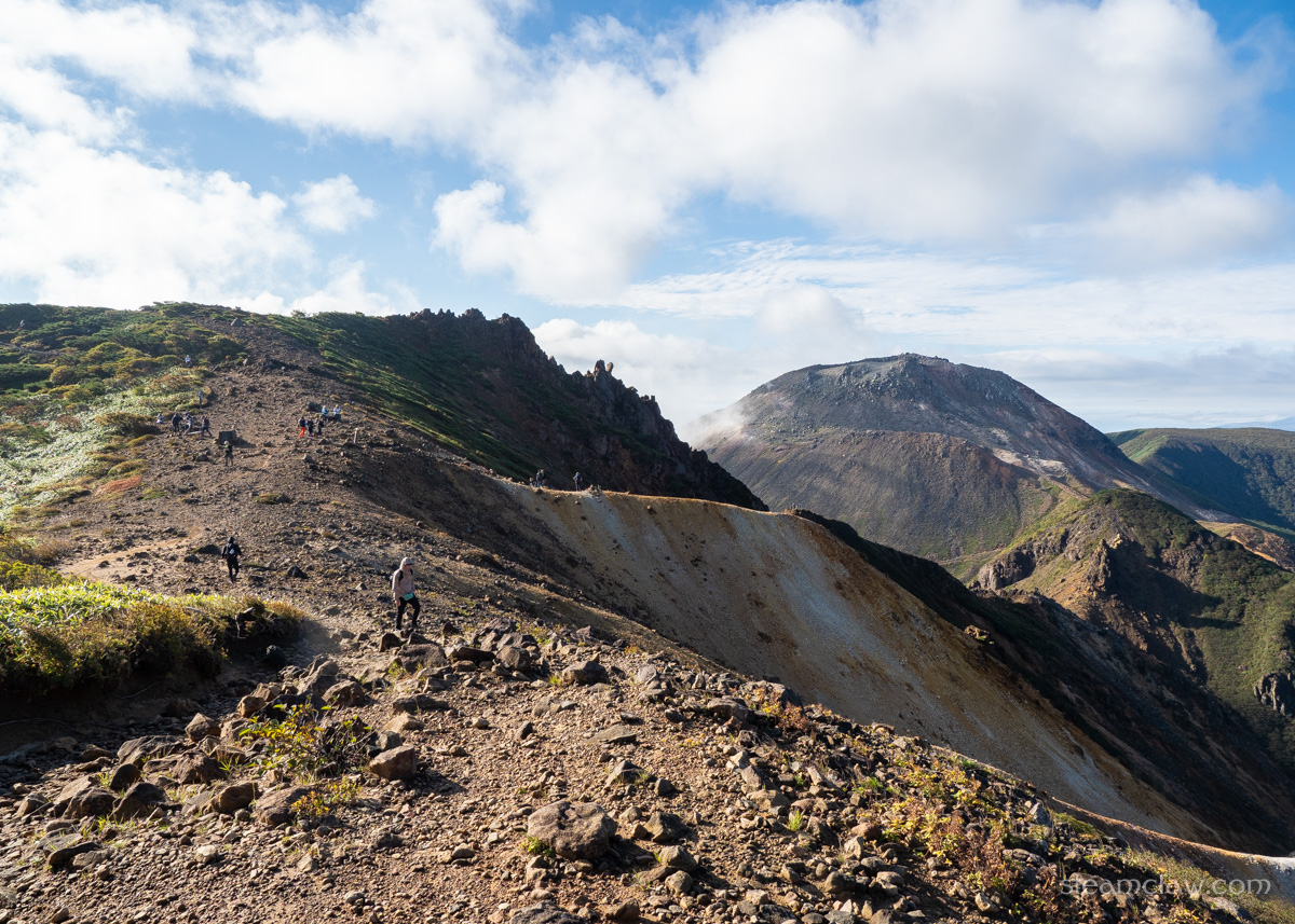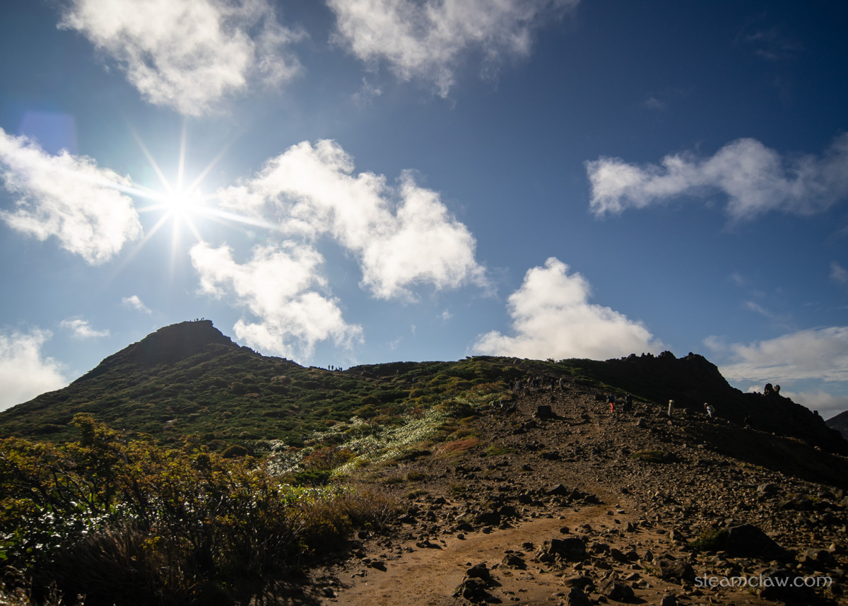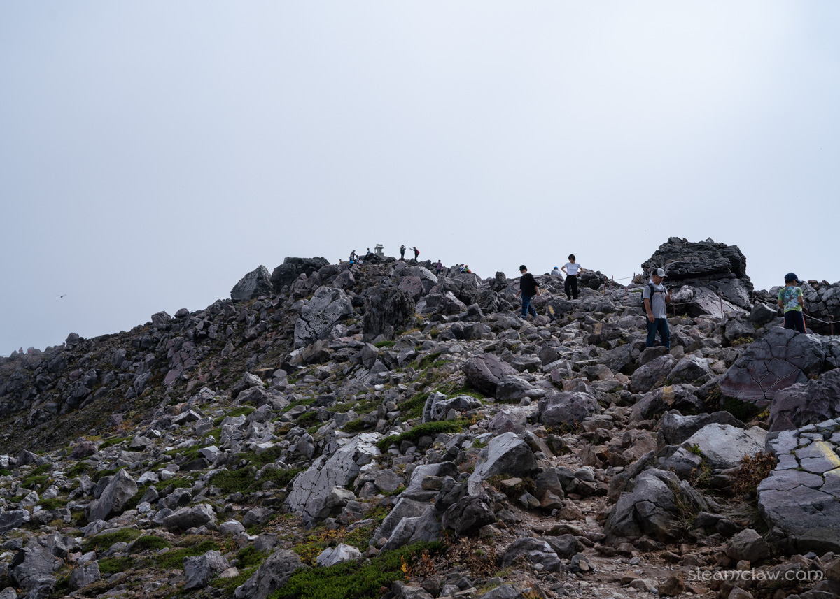 さすがに朝日岳は人数が多いとはいえハイカーしか見かけませんでしたが、ロープウェイで登ってこられるこの茶臼岳は、軽装の観光客も多い。13時過ぎという遅い時間に登ってきていることもあり、我々が到着した頃にはハイカーよりも観光客が目立つくらいでした。