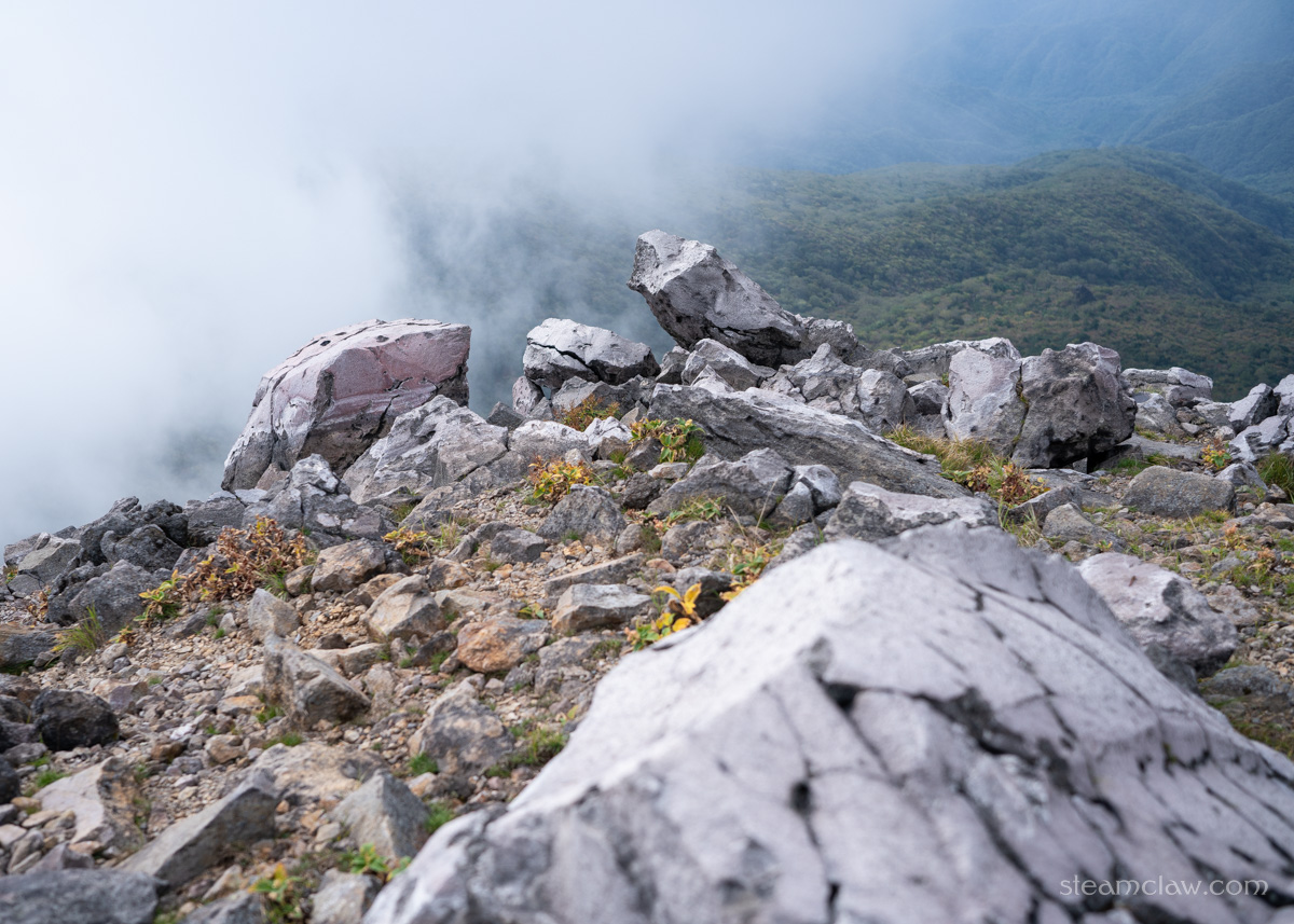 朝日岳分岐に到着したころには、朝日岳はすっかりガスの真っ只中。先に登頂しておかなかったことを悔やみつつ朝日岳のピークを踏みます。20分ほど山頂で粘ってみたものの、どうにもならなさそうなので先に進むことに。