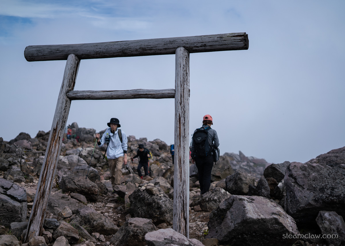 山頂付近は観光客に占領されているし、相変わらずガスまみれで展望もないので、さっさと下山することに。鳥居をくぐって分岐点に進み、分岐を左折して峰ノ茶屋避難小屋への道を戻っていきます。