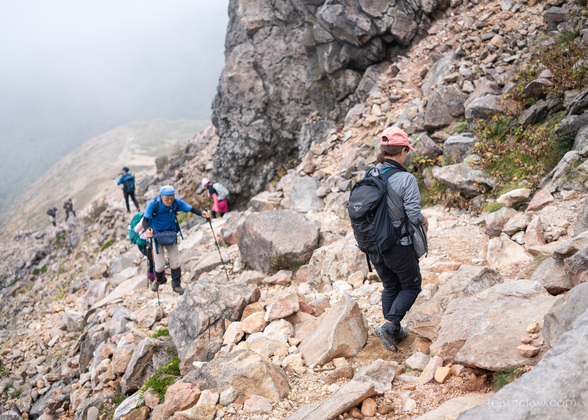 ただ、最後の茶臼岳山頂だけはガスで陽射しが届かなくなったことと、風がやや強まったことで体感温度が低下。最低限ミッドレイヤーは必要、もし長時間停滞するのであればアウターまで欲しいかなという感覚だったので、ある程度は服装に余裕をもっておいたほうが良いと思います。