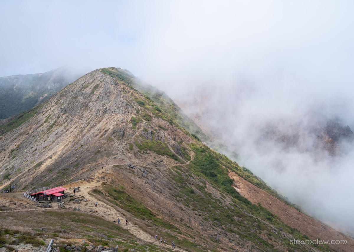 三本槍岳に到着したのはまだ9時くらいだったので、写真撮影と携行食補給だけして行動再会。再びきた道を戻っていきます。三本槍岳だけから茶臼岳を振返ったときにガスが増えてきたことが気がかりでしたが、どんどんガスが濃くなっていきます。