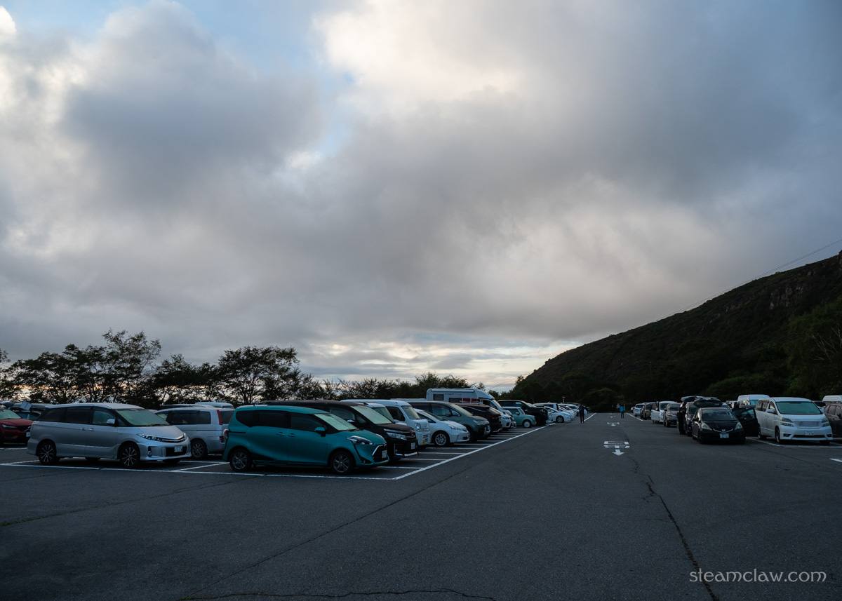 駐車場は公衆トイレすぐ手間の第一駐車場、やや手前の第二駐車場あわせて160台程度のスペースがあります。夜11時頃に到着した際はまだ第一駐車場が半分埋まっているかどうか、という程度でしたが、日出時にはもう駐車場難民が発生していましたので、早めの到着がオススメ。