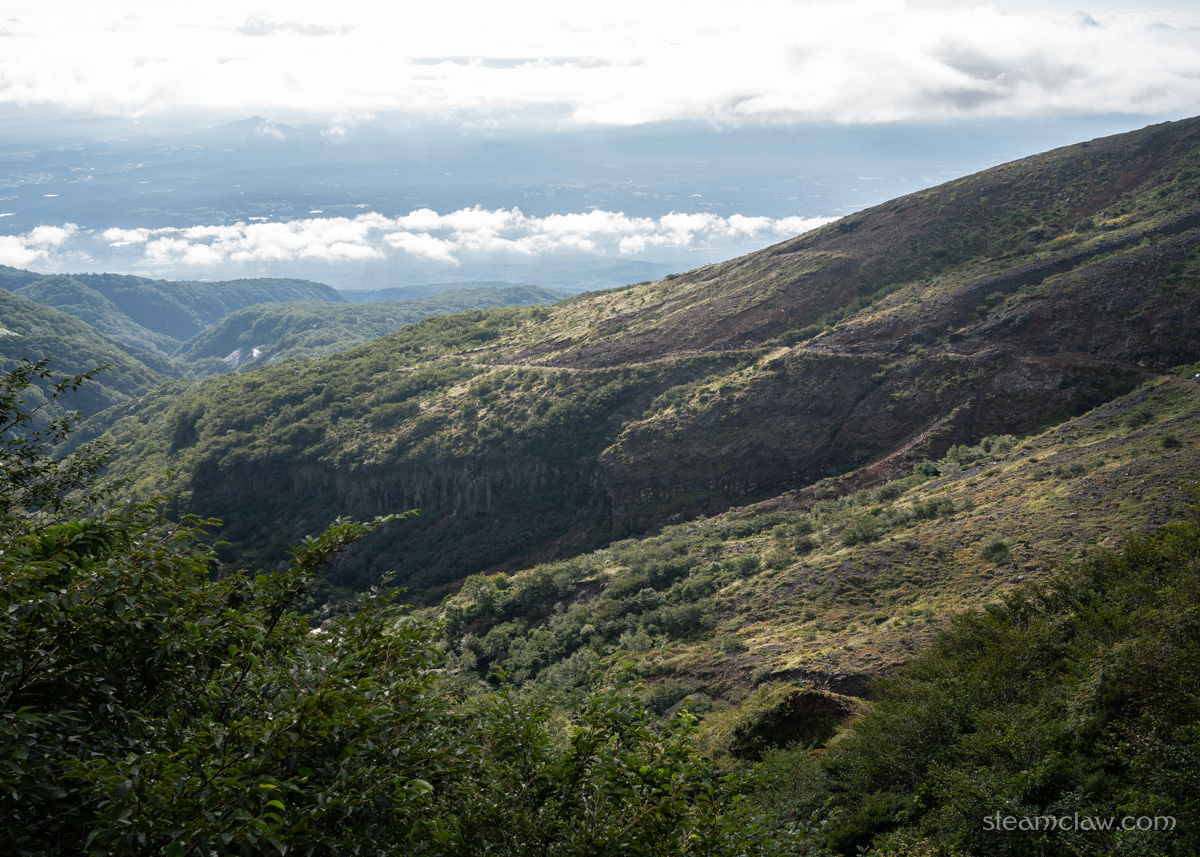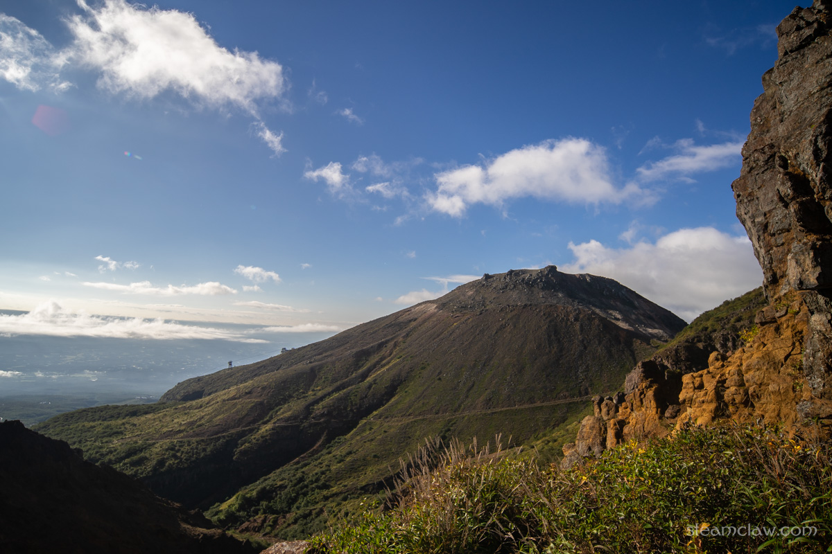 ちなみに、先ほど掲載したお釜口から峰ノ茶屋避難小屋を写した写真をみると、山頂付近が黒っぽい石で覆われているのに対して中腹あたりが白っぽくなっているのがわかりますが、これは1408年の水蒸気爆発で噴出された堆積物だそうです。