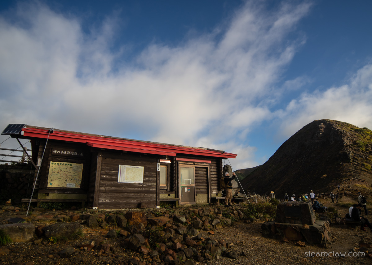 神々しい景色を楽しみながらゆるゆる登っていくと、まもなく峰ノ茶屋跡避難小屋。峰ノ茶屋という名前が紛らわしいですが、トイレや売店など併設されていない、ただの避難小屋ですので補給などを期待しないよう注意。