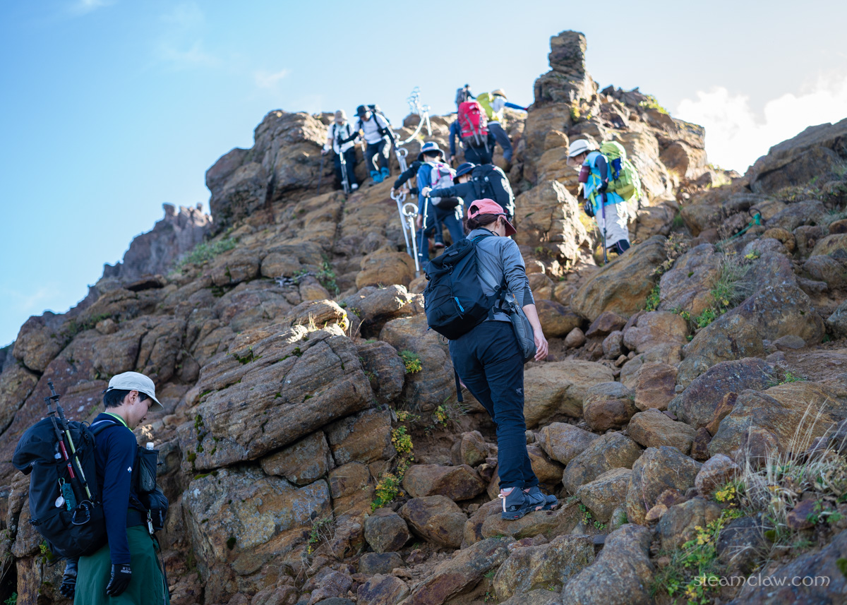 山頂付近のガスが晴れ渡った茶臼岳の雄姿を目に焼き付けて朝日岳に向かいます。今度は馬の背のような(すれ違いできる広さなので危険度ありません)岩場。なおここまでの登りですが、せいぜい20分くらいの距離しかありません。