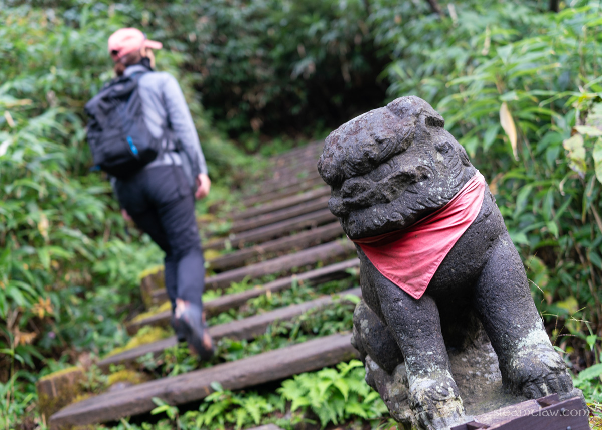 登山口は駐車場に併設されているトイレの裏から、または駐車場脇にある峠の茶屋から続いています。狛犬に見守られながら鳥居をくぐり抜けて登山開始です。