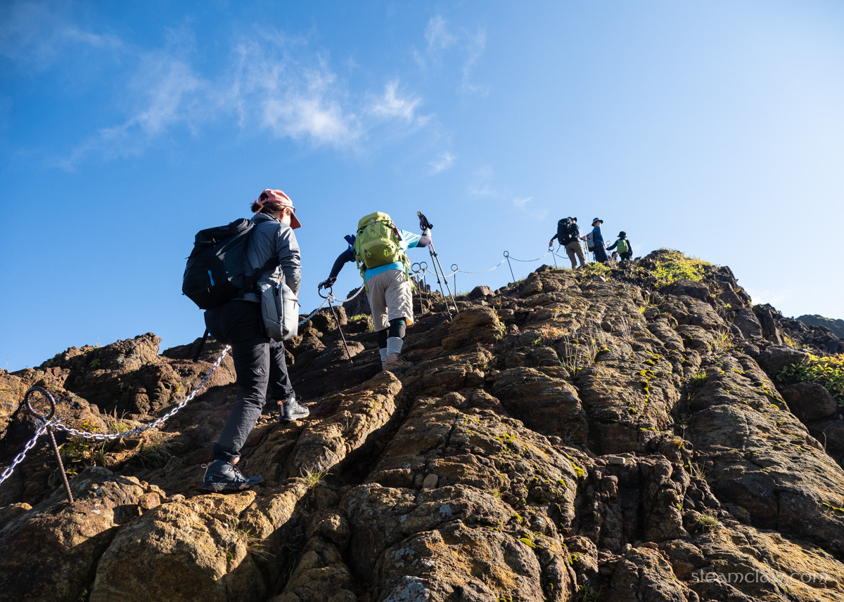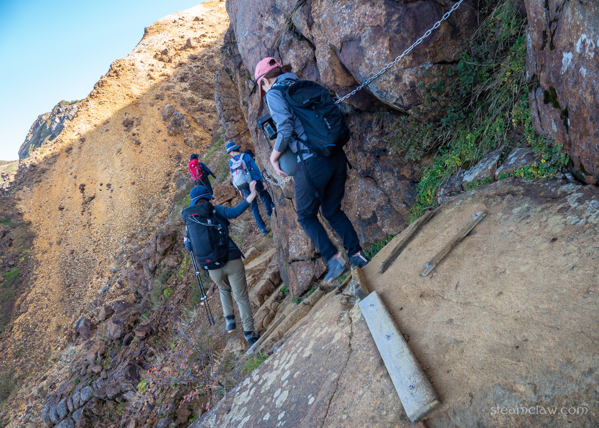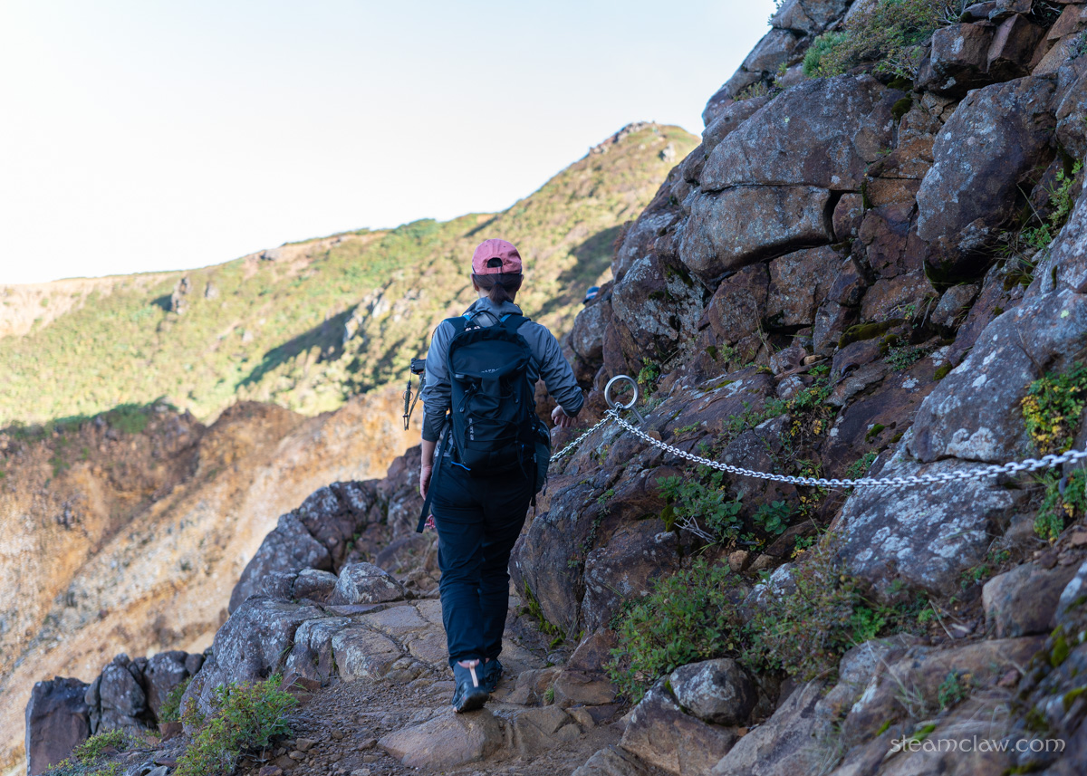 一通り登りきったところで、今度は狭い山肌のトラバース路へ。すれ違いはちょっと難しいなあという道幅で高度感もありますが、1人が通行するには十分ですし、クサリや滑り止めの木板などで丁寧に整備されているので、危ないなと思うところはありませんでした。