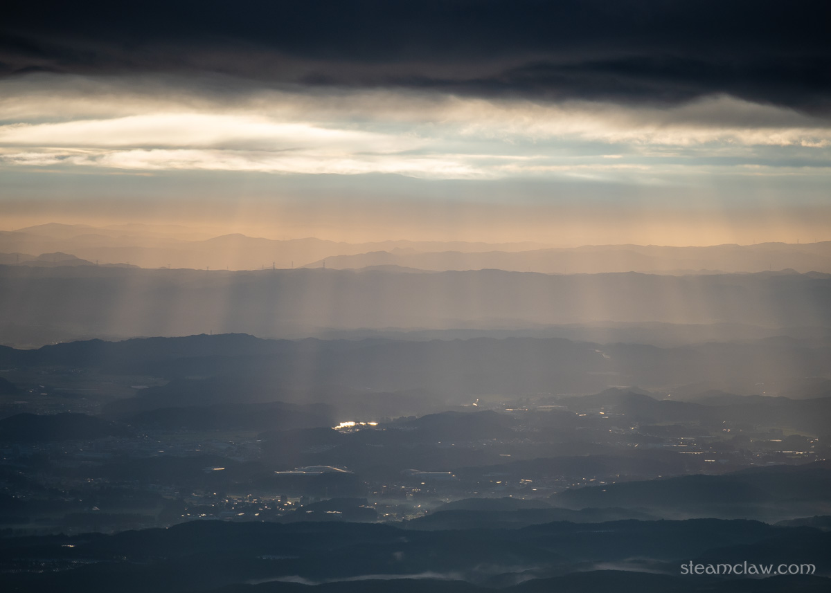 登山口を過ぎてしばらくはよく整備された階段を登っていきます。この段階では視界も開けていないのであまり楽しくはありませんが、木々の切れ間から振返ってみると那須・白河市方面に雲の切れ間から陽がさしていました。神秘的な眺めにしばし足をとめたのち、登山再会です。