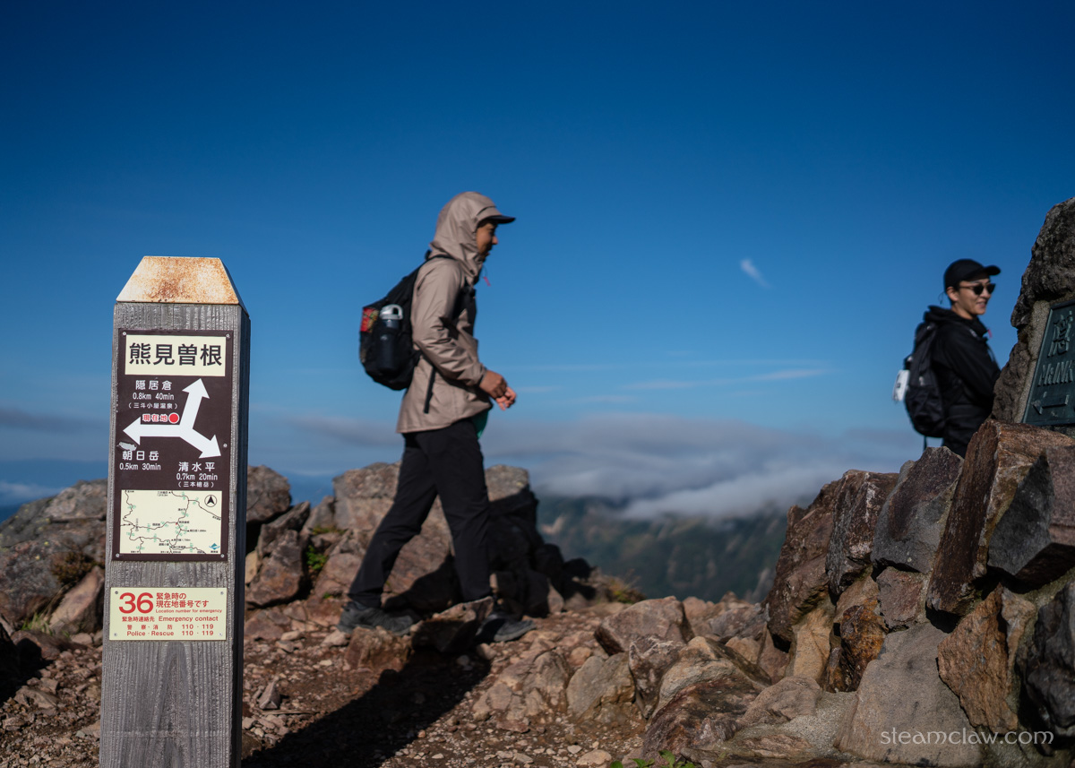 その朝日岳のピークですが、三峰のなかでは最も険しい山だけあって、休憩スペースは限られます。しかも登山口から近いためハイカーの数が圧倒的に多く、あまりのんびり休憩できる雰囲気ではない。分岐点付近の肩部のほうが地形としてはなだらかなので、そちらで休憩している人のほうが多かったように思います。