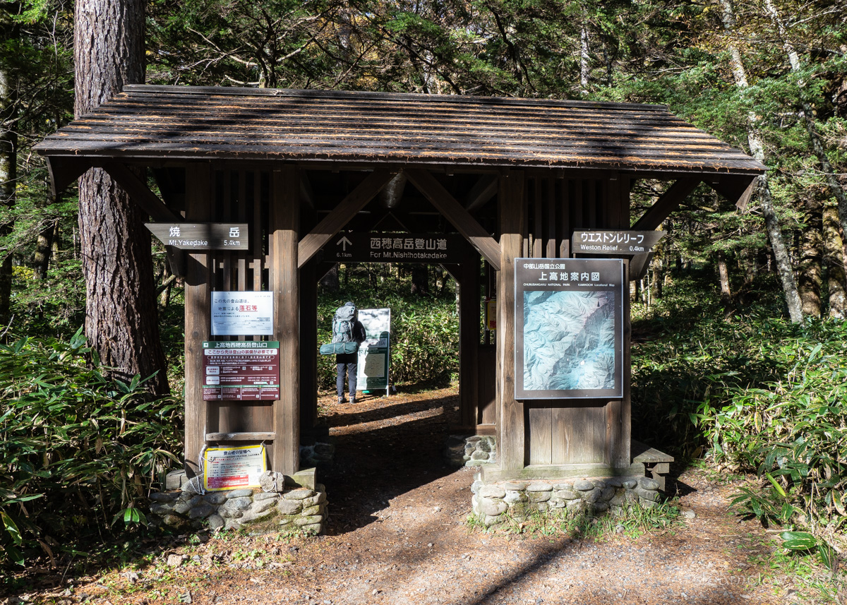 湿原を抜けて梓川沿いをテクテク歩いていくと、田代橋を越えて西穂登山口です。小さな東屋があるので、軽く朝食をとることに。ここでは登山届の記入・提出もできます。穂高連峰は長野県登山安全条例で登山届の提出が義務化されているので、忘れないようにしましょう。
