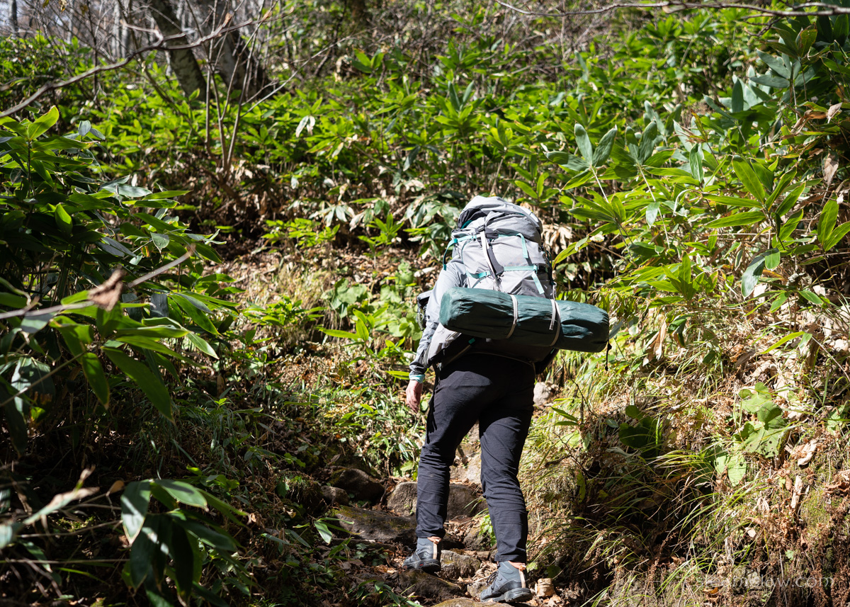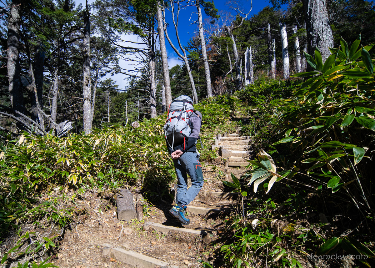 登山道自体は階段などよく整備されているのですが、テント泊装備を背負っていることもあり、メンタル的には結構キツい登りでした。せめて途中どこかから上高地を見下ろしたり、梓川を挟んだ霞沢岳あたり見渡せたりすればちょっとは違うんでしょうけどね😥