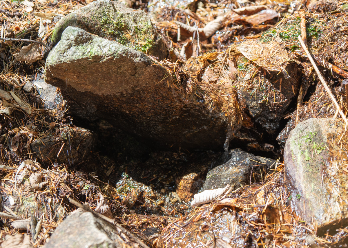 中尾根沿いに若干のアップダウンがある道を進んでいくと、宝水に到着。西穂山荘ができる前は貴重な水場だったのでしょうが、水量がめちゃくちゃ少ない(500mlペットボトルを満タンにするのに1分かかりそう)ので、緊急事態でもなければさっさと山荘を目指したほうが早いかな💧