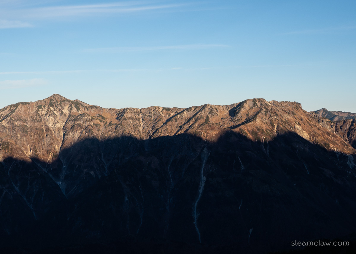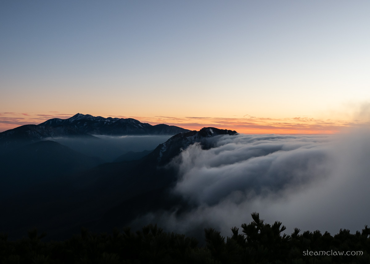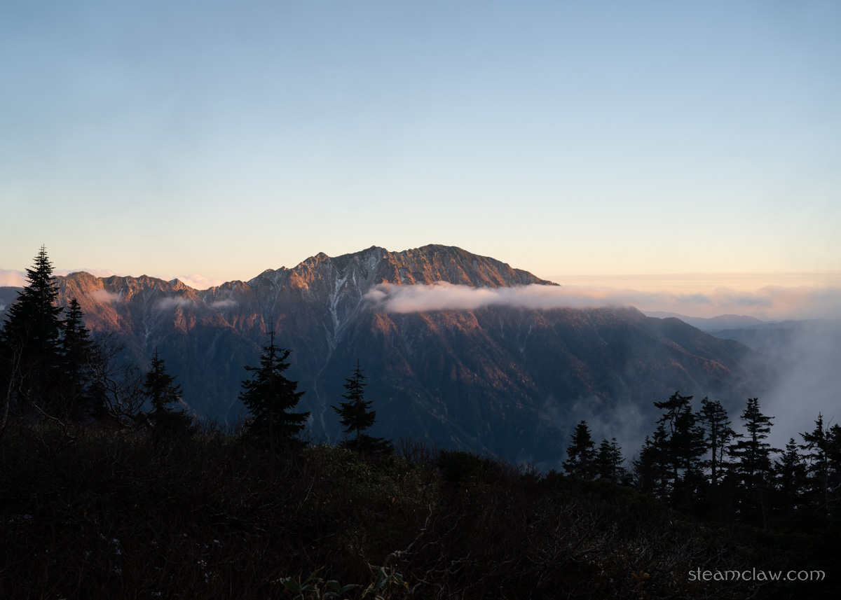まだ完全にガスが晴れたわけではなく、東の霞沢岳方面は比較的よく見えますが、反対の笠ヶ岳方面はまだ雲が厚く垂れ込めたまま。そのガスが稜線に吹き上げてくると、ついさっきまで見えていた霞沢岳もまた見えなくなる…という繰り返しでしたが、陽が落ちるにつれだいぶ収まってきました。