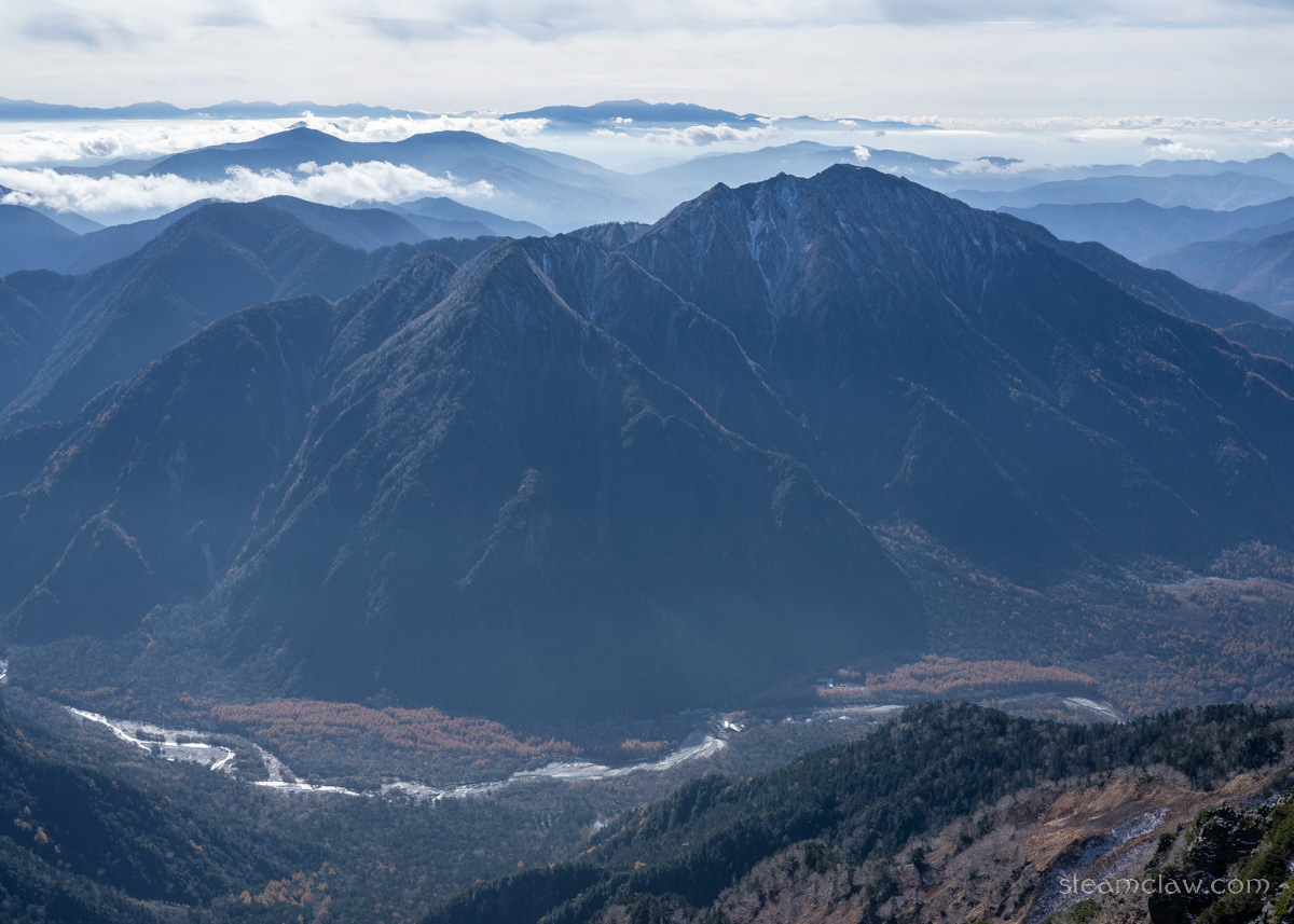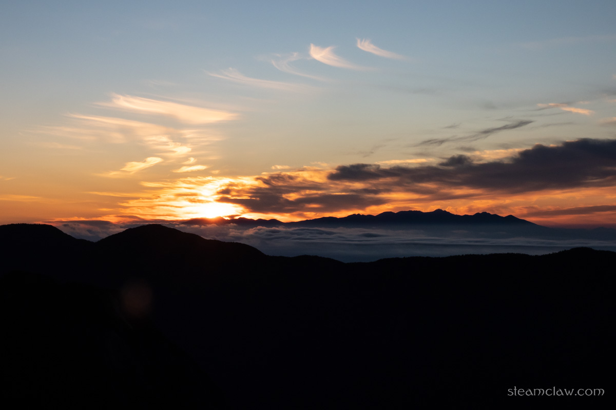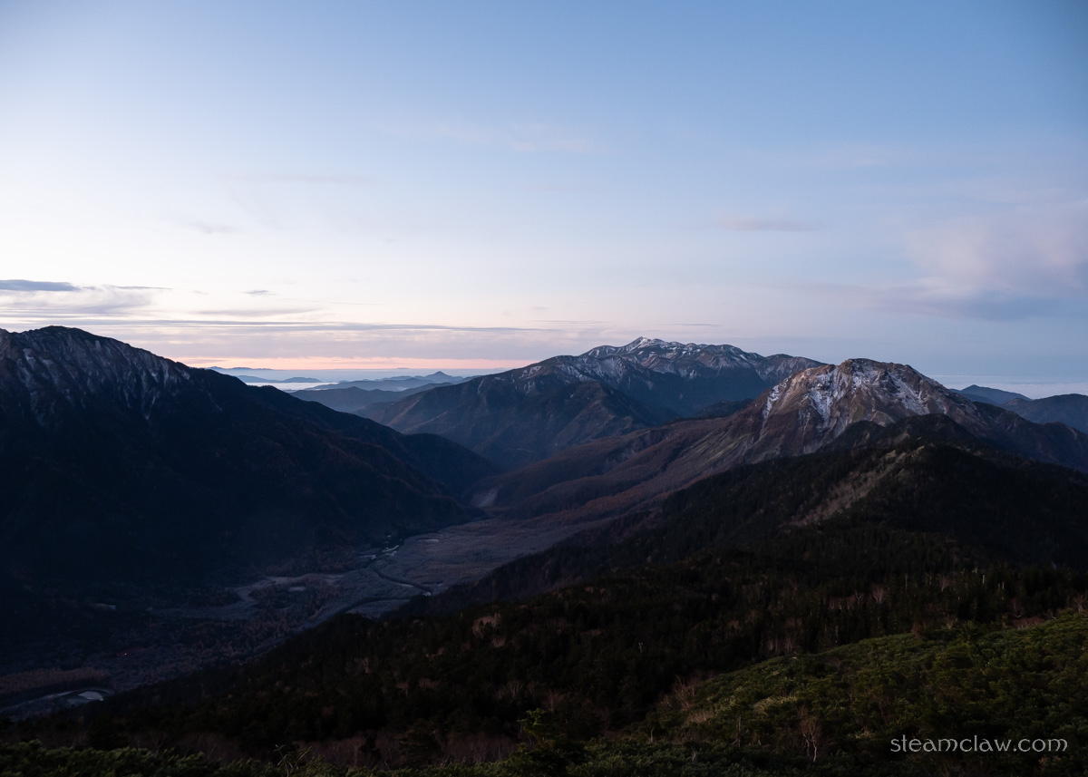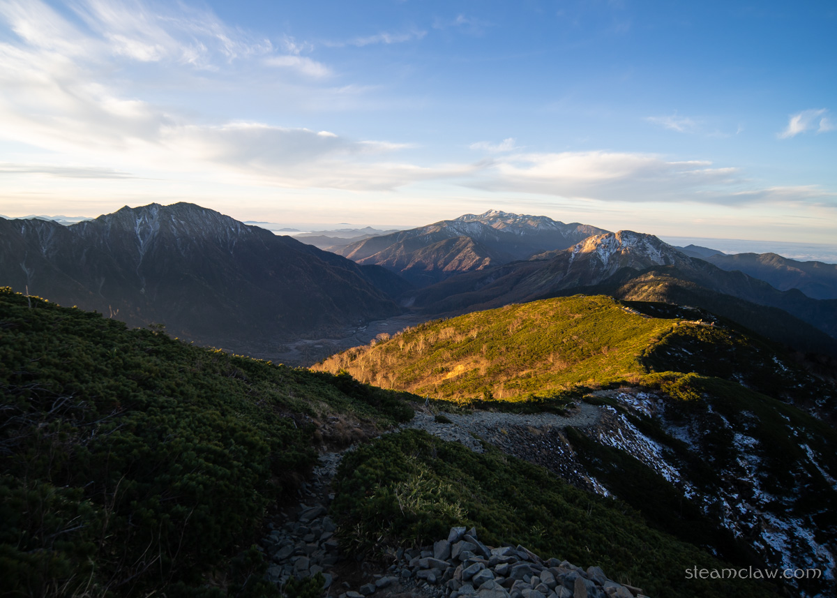 まだ完全にガスが晴れたわけではなく、東の霞沢岳方面は比較的よく見えますが、反対の笠ヶ岳方面はまだ雲が厚く垂れ込めたまま。そのガスが稜線に吹き上げてくると、ついさっきまで見えていた霞沢岳もまた見えなくなる…という繰り返しでしたが、陽が落ちるにつれだいぶ収まってきました。