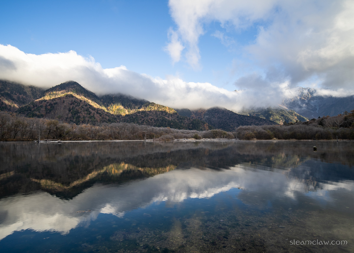 大正池は、活火山である焼岳が1915年に噴火したことで、梓川が堰き止められて形成されたという池。写真愛好家にも人気のスポットのようで、始発近いバスに乗ってきたというにも関わらず、大勢のカメラマンが三脚を立てての撮影に勤しんでいました。