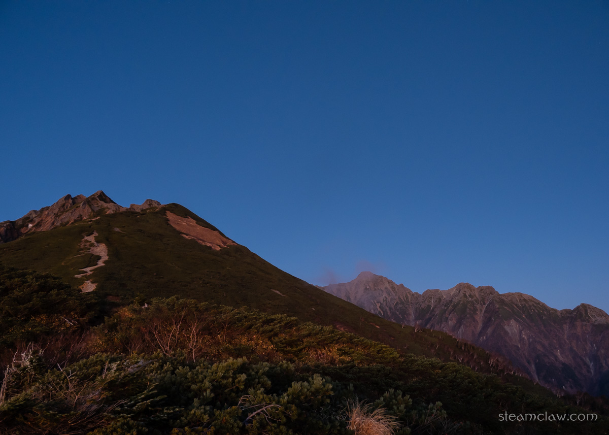 西穂独標と穂高連峰方面も、ほんのりオレンジがかっています